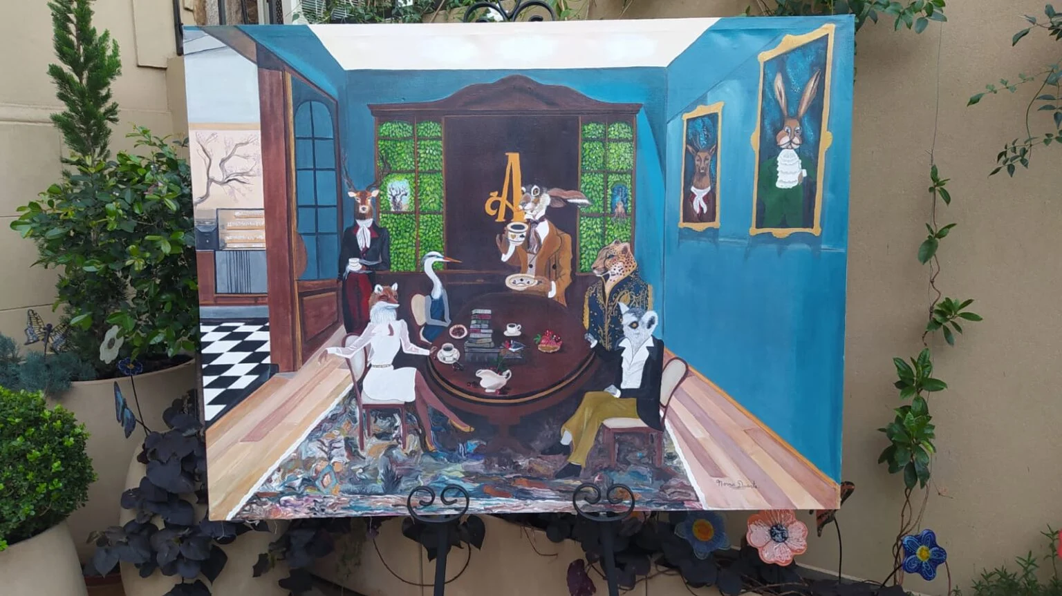 “El cuadro es un lugar de acá adentro de Alegrarte, que tiene cuadro de animales que invitan a mirar, a detenerse. Entonces los animales ahora están en ese espacio tomando el té, en la hora mágica”, comenzó explicando sobre su inspiración Norma.