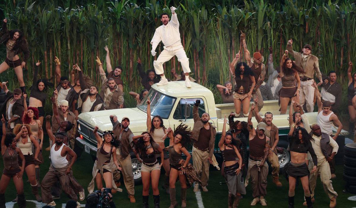 El artista puertorriqueño apareció en escena con una frase que funcionó como declaración de principios: “¡Qué rico es ser latino!”. A partir de allí, el espectáculo se desarrolló como un videoclip en vivo que combinó imágenes en el campo de juego con segmentos pregrabados, escenografías móviles y referencias a tradiciones latinoamericanas. El inicio, ambientado en un sembradío montado sobre el césped, dio paso a “Tití me preguntó”, interpretada por Bad Bunny vestido de blanco y con un balón de fútbol americano como símbolo del cruce cultural.