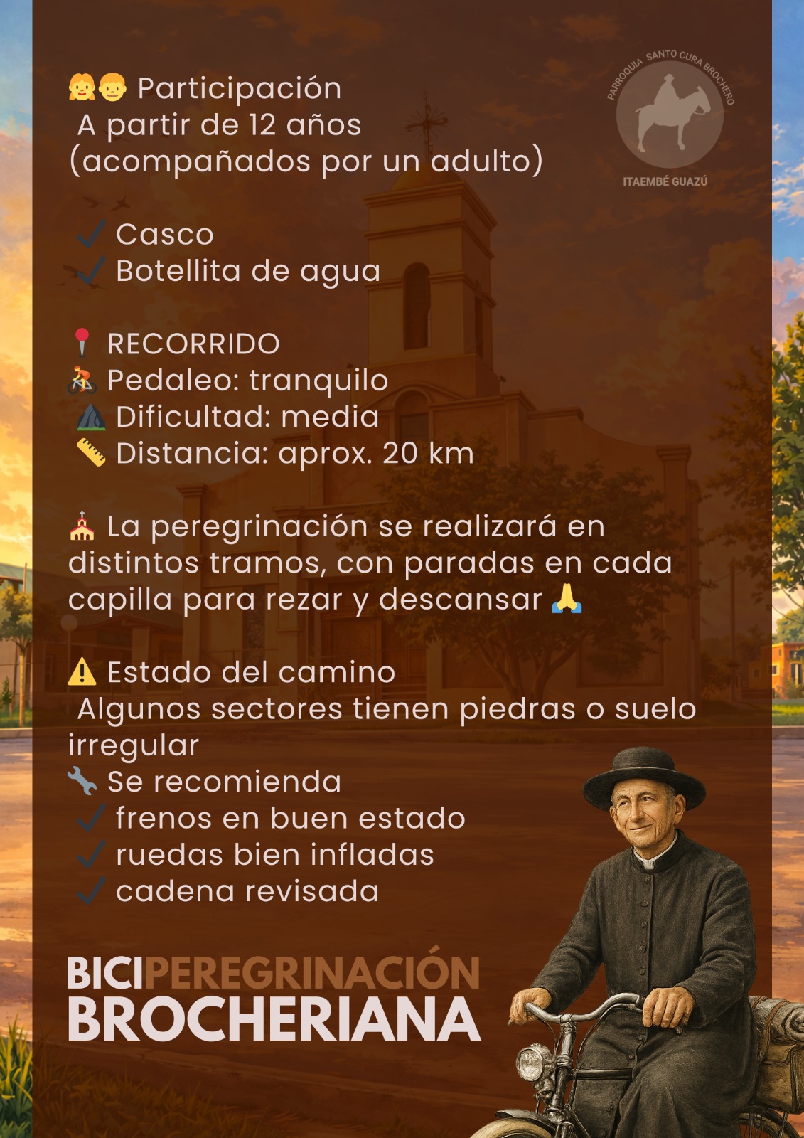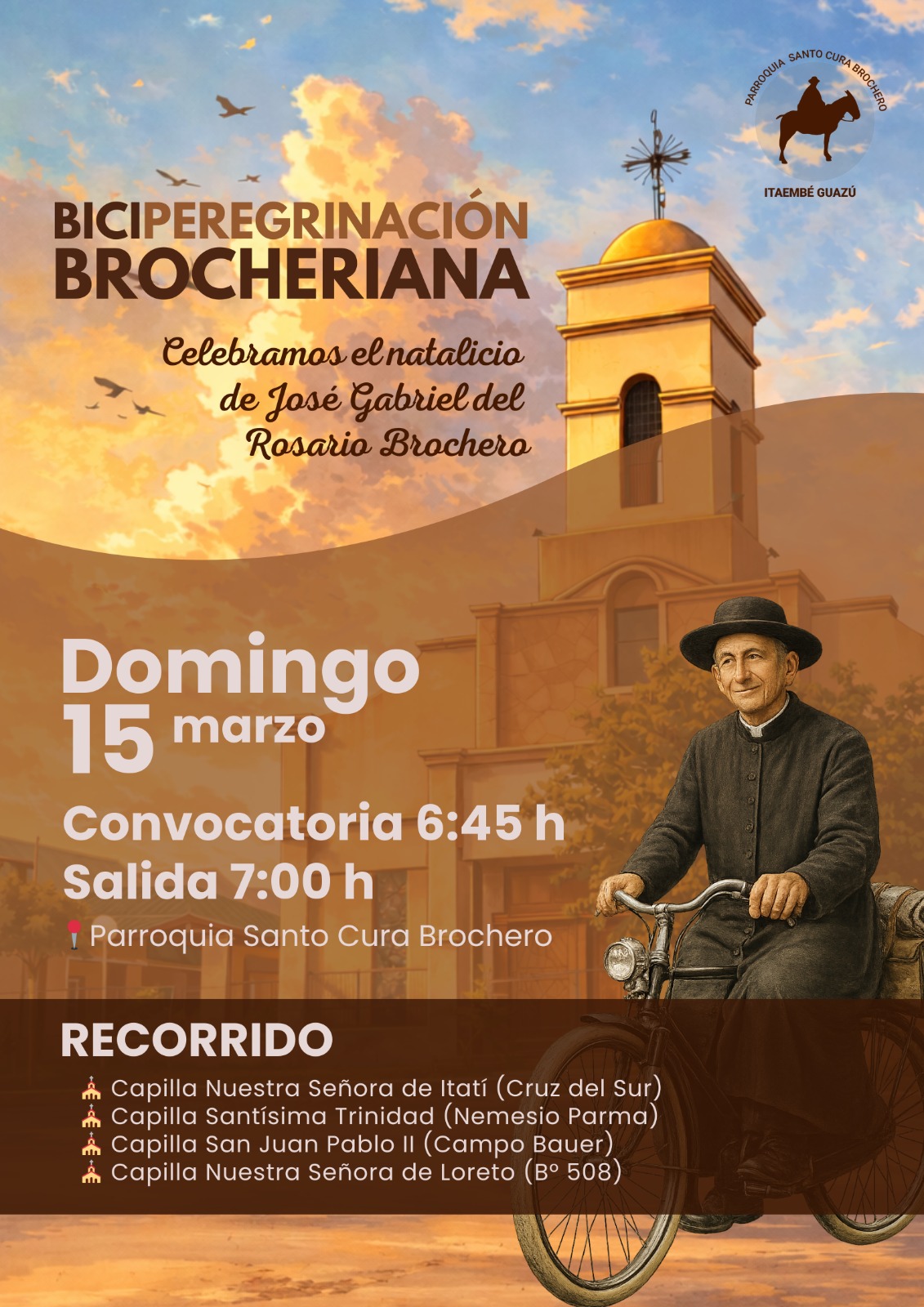 Este domingo 15 de marzo, la comunidad de la parroquia Santo Cura Brochero del barrio Itaembé Guazú realizará una nueva biciperegrinación brocheriana, una propuesta que combina fe, deporte y encuentro comunitario en el marco de las celebraciones por el natalicio de San José Gabriel del Rosario Brochero.