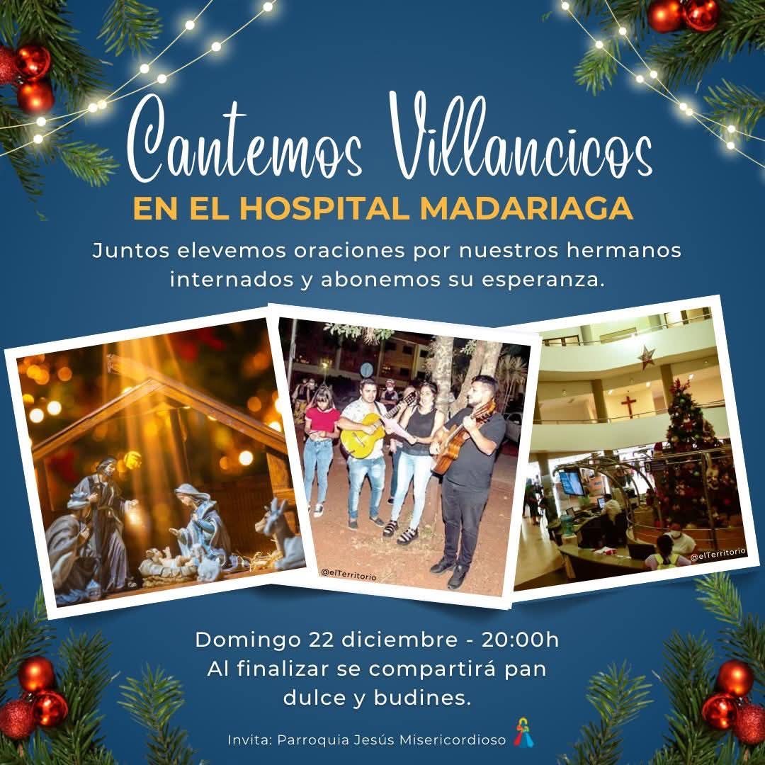Este domingo 22 de diciembre, a las 20:00 horas, la Parroquia Jesús Misericordioso invita a todos a unirse en un acto de solidaridad y esperanza en el Hospital Madariaga. La propuesta es compartir una emotiva velada de villancicos, elevando oraciones por los hermanos internados y brindando un mensaje de aliento en estas fiestas.
