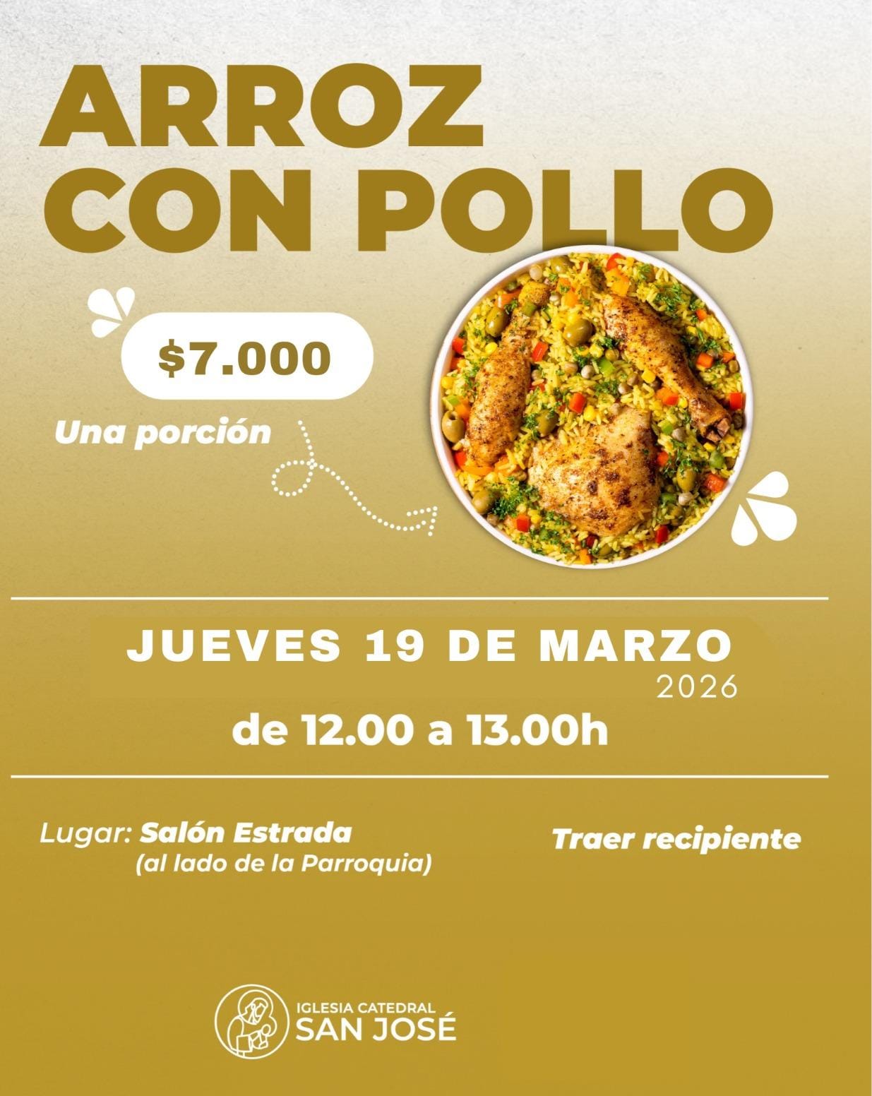 En el marco del día del patrono de la ciudad, este jueves 19 de marzo la Catedral San José de Posadas organizará su tradicional venta de arroz con pollo, una iniciativa a cargo del grupo Santa Marta destinada a cubrir los gastos de mantenimiento del templo y colaborar con la comunidad. La actividad se desarrollará de 12 a 13 horas en el salón Estrada, anexo a la parroquia, y los interesados deben llevar su propio recipiente tipo tupper para retirar las porciones.