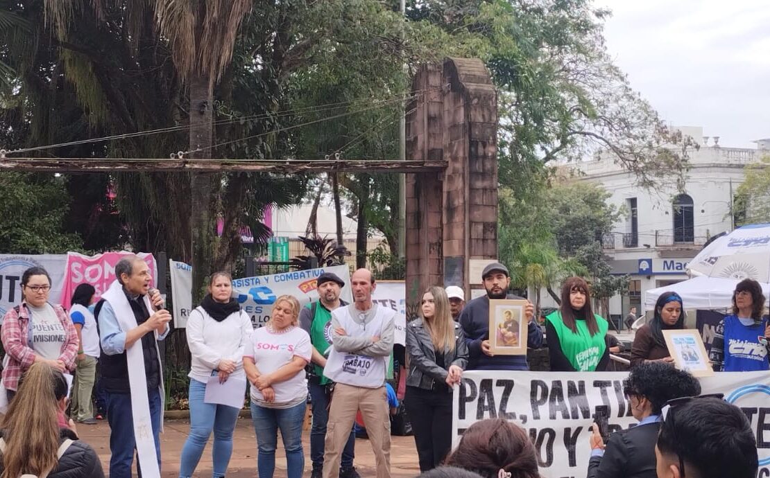 Durante el acto central por el Día de San Cayetano en la Plaza 9 de Julio de Posadas, el padre Alberto Barros, vicepresidente de Cáritas Posadas,...