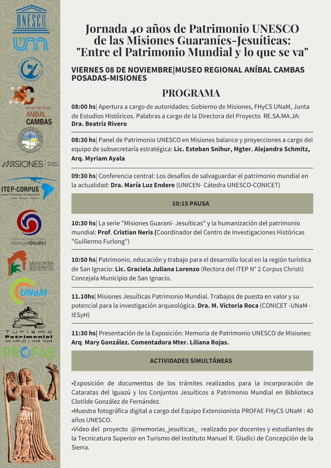 Este viernes 8 de noviembre, el Museo Regional Aníbal Cambas de Posadas conmemora un evento significativo: la Jornada 40 Años de Patrimonio UNESCO de las Misiones Guaraníes-Jesuíticas: «Entre el Patrimonio Mundial y lo que se va». La celebración incluye actividades organizadas en colaboración con diversas instituciones, como la Universidad Nacional de Misiones (UNaM) y la Secretaría de Cultura.