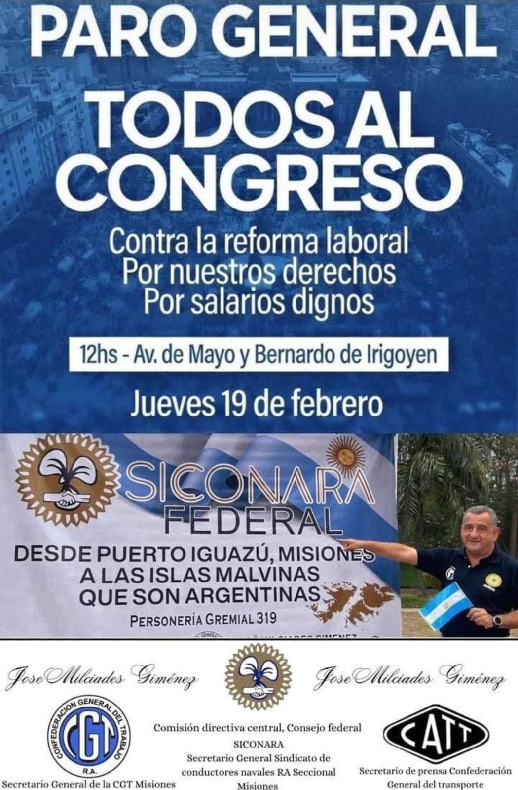 El Secretario General de la CGT Misiones, José Milcíades Giménez, quien también integra la Comisión Directiva del SICONARA, confirmó este lunes la realización de una medida de fuerza nacional prevista para el próximo jueves 19 de febrero. La decisión se enmarca en la preocupación del movimiento sindical por la aprobación de la reforma laboral y su impacto en los trabajadores.