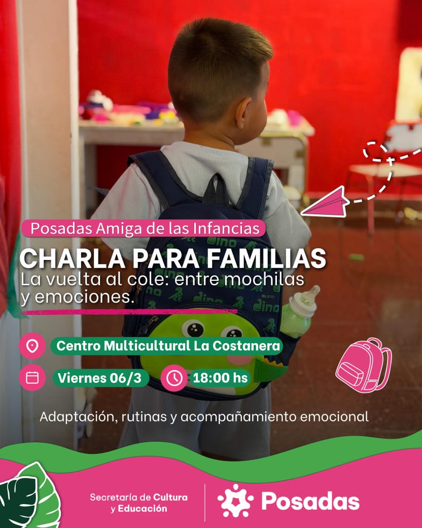 La Municipalidad de Posadas invita a participar de una charla abierta destinada a familias en el marco del inicio del ciclo lectivo. La propuesta, titulada “La vuelta al cole: entre mochilas y emociones”, se llevará a cabo este viernes a las 18 en el Centro Multicultural de la Costanera, cuarto tramo, con el objetivo de acompañar a padres, madres y cuidadores en los procesos de adaptación escolar de niños y niñas.