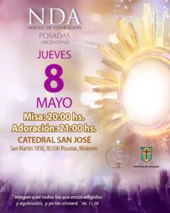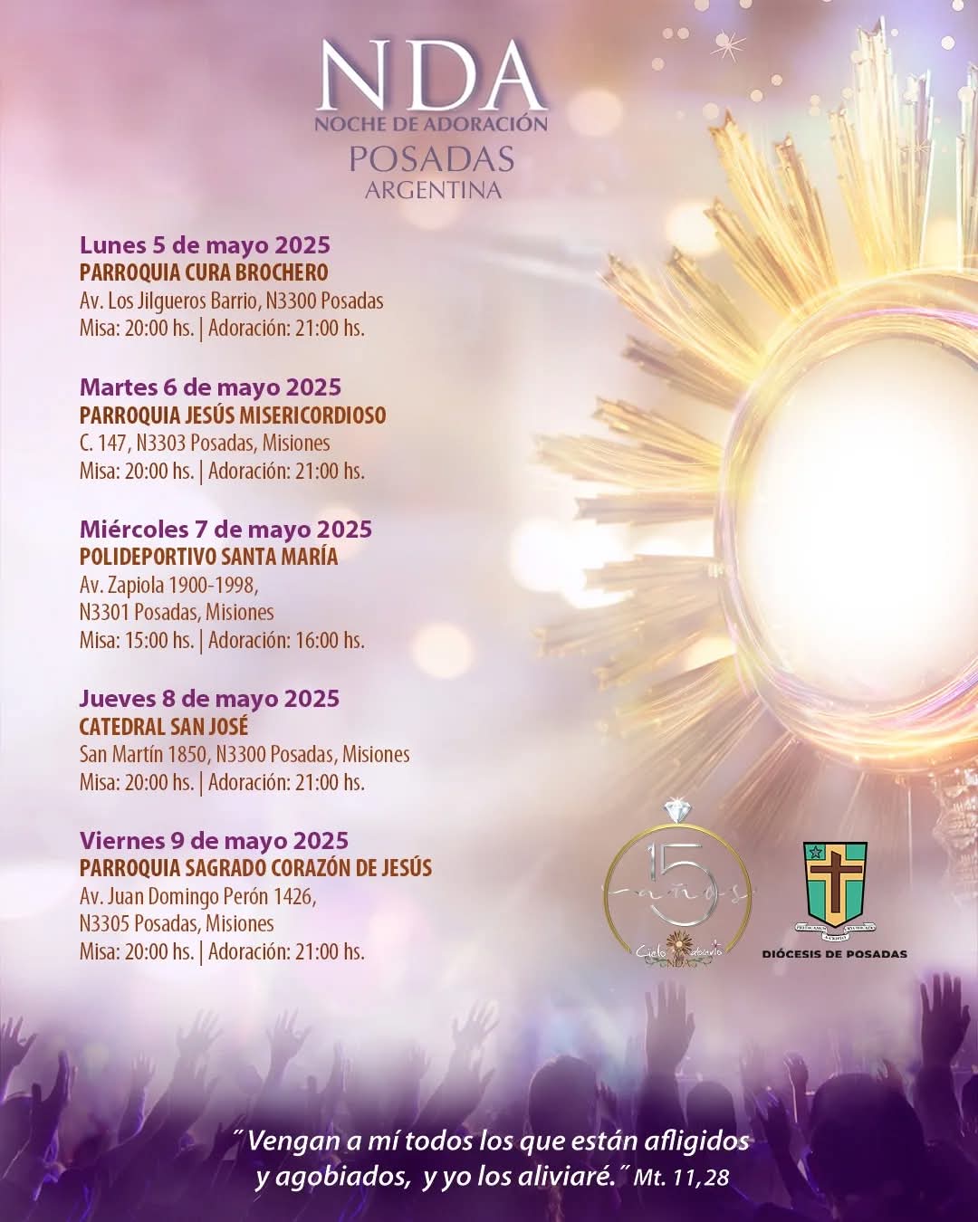 En primera instancia, las actividades comenzarán el lunes 5 de mayo y se extenderán hasta el viernes 9 de mayo con la realización de las tradicionales Noches de Adoración (NDA), que tendrán lugar en diversas parroquias locales. Cada jornada incluirá la celebración de la Santa Misa, seguida por un tiempo de adoración al Santísimo Sacramento, brindando a los fieles la oportunidad de renovar su fe y encontrarse con Jesús Eucaristía.