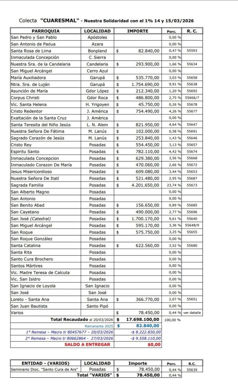 Además, se registraron otros aportes, entre ellos: Inmaculada Concepción (Posadas) $629.380,00; San Catalina (Posadas) $622.560,00; Jesús Misericordioso (Posadas) $609.080,00; San Miguel Arcángel (Posadas) $595.170,00; San Roque (Posadas) $575.750,00; Cristo Rey (Posadas) $554.450,00; Nuestra Señora de Itatí (Posadas) $521.480,00; San Cayetano (Posadas) $490.000,00; Corpus Christi (Gobernador Roca) $486.800,00; Inmaculado Corazón de María (Posadas) $470.060,00; Loreto–Santa Ana $366.770,00; Sagrado Corazón de Jesús (Miguel Lanús) $253.840,00; Asunción de María (Gobernador López) $212.340,00; San Benito Abad (Posadas) $156.650,00; Nuestra Señora de Fátima (Miguel Lanús) $102.000,00; Santa Rosa de Lima (Bonpland) $82.840,00 y Vicaria Santa Helena (Hipólito Yrigoyen) $45.750,00.