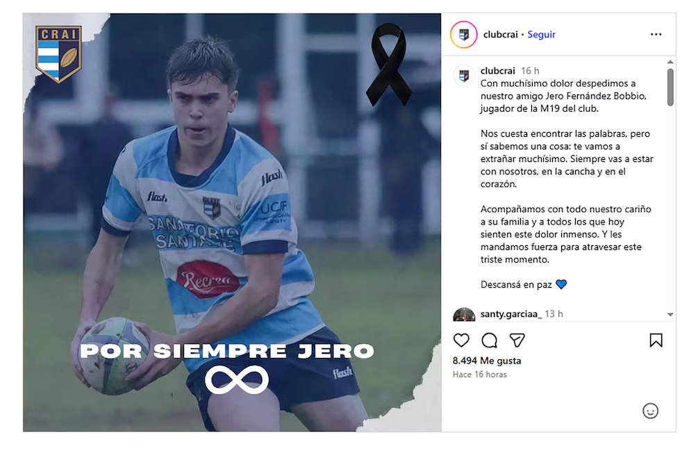 “El rugby santafesino está de luto. Desde la USR despedimos con enorme tristeza a Jero. Acompañamos a su familia, a sus seres queridos y a toda la familia del CRAI en este doloroso momento. Que el recuerdo de Jero los abrace y les dé fuerza”.