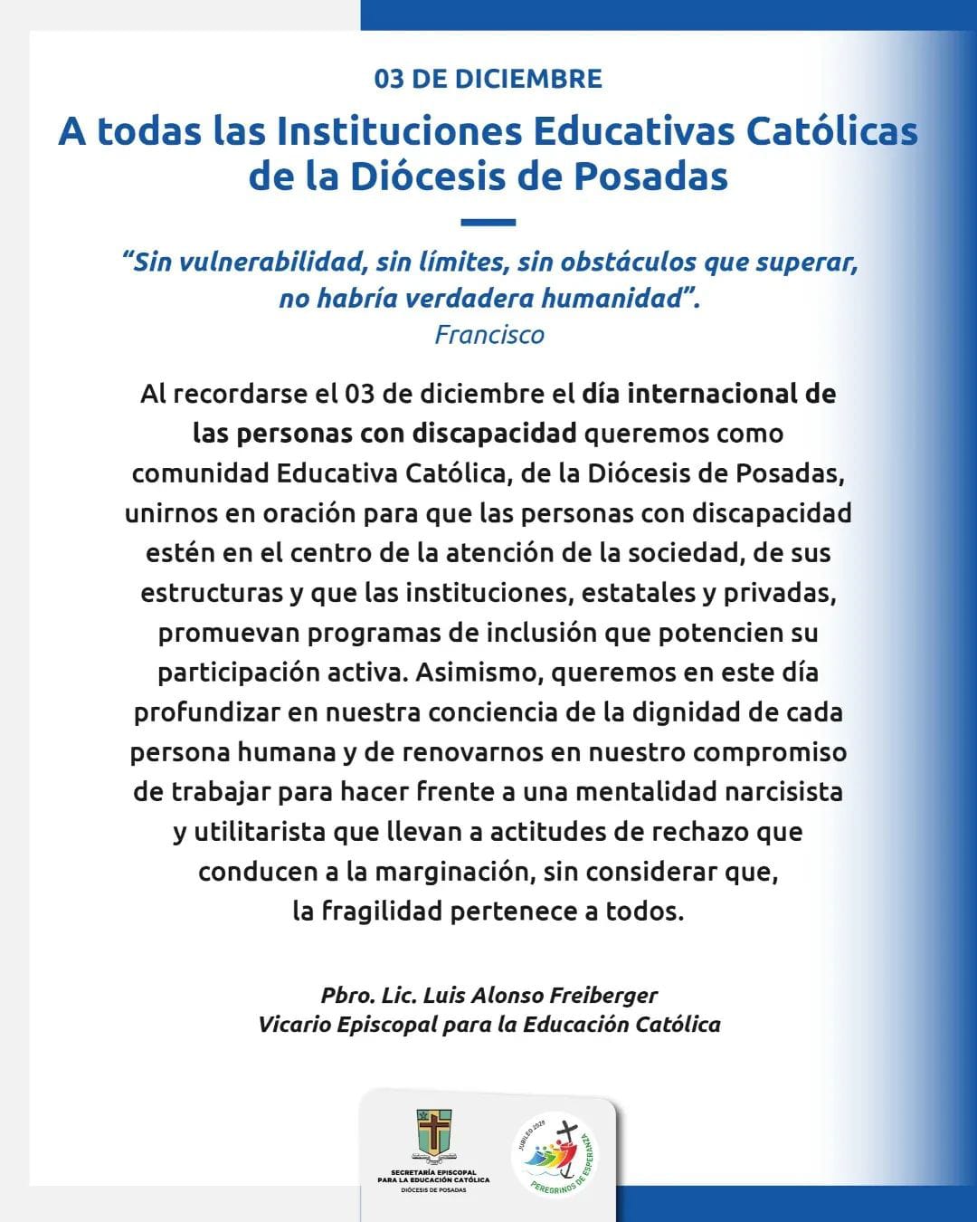 En el marco del Día Internacional de las Personas con Discapacidad, la Diócesis de Posadas difundió un mensaje dirigido a todas las Instituciones Educativas Católicas, invitando a profundizar el compromiso institucional y comunitario con la inclusión y el respeto por la dignidad humana.