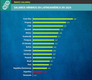 Comparando el salario mínimo de Argentina con el de otros países de la región, el panorama es desalentador. Con un SMVM de tan solo US$164, Argentina ocupa uno de los últimos puestos en el ranking regional, con Venezuela liderando este listado con un SMVM de 3,61 dólares.