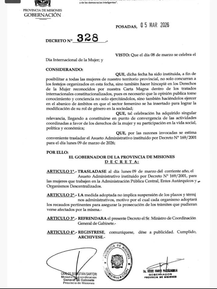 El gobernador de Misiones, Hugo Passalacqua, dispuso trasladar al lunes 9 de marzo el asueto administrativo destinado a las mujeres que se desempeñan en la administración pública provincial.