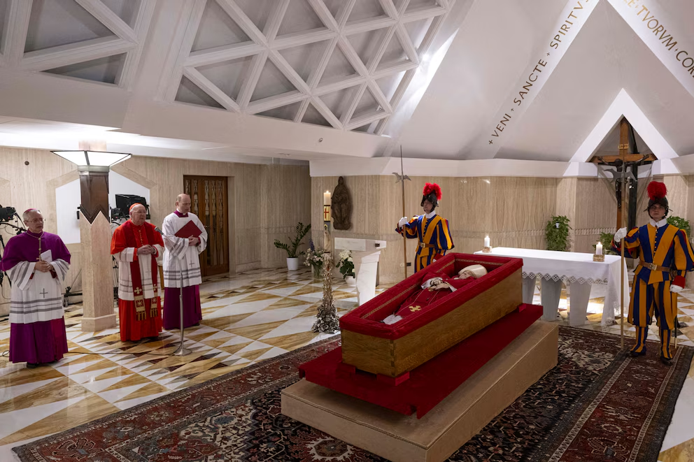 El cuerpo del Papa Francisco descansaba hasta ahora en la capilla privada de la residencia vaticana, donde se realizó el rito de constatación de su muerte en la noche del lunes, en presencia de sus colaboradores más cercanos y cardenales que se encontraban en Roma. El miércoles, el féretro será transportado a la basílica para que los fieles puedan ofrecerle su último adiós.