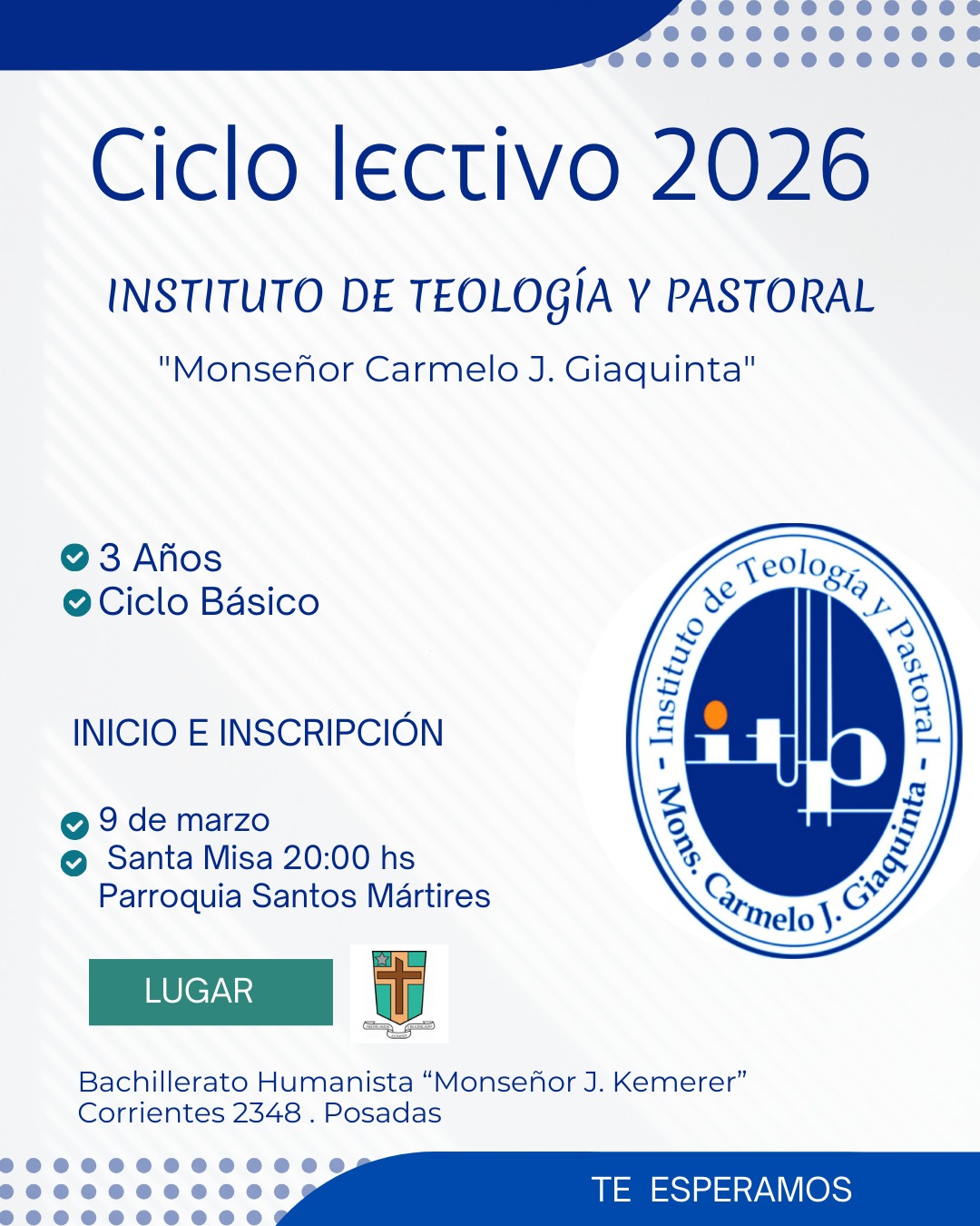 El Instituto de Teología y Pastoral “Monseñor Carmelo J. Giaquinta” informó la apertura de inscripciones para el ciclo lectivo 2026 de su Ciclo Básico, una propuesta académica con una duración de tres años.
