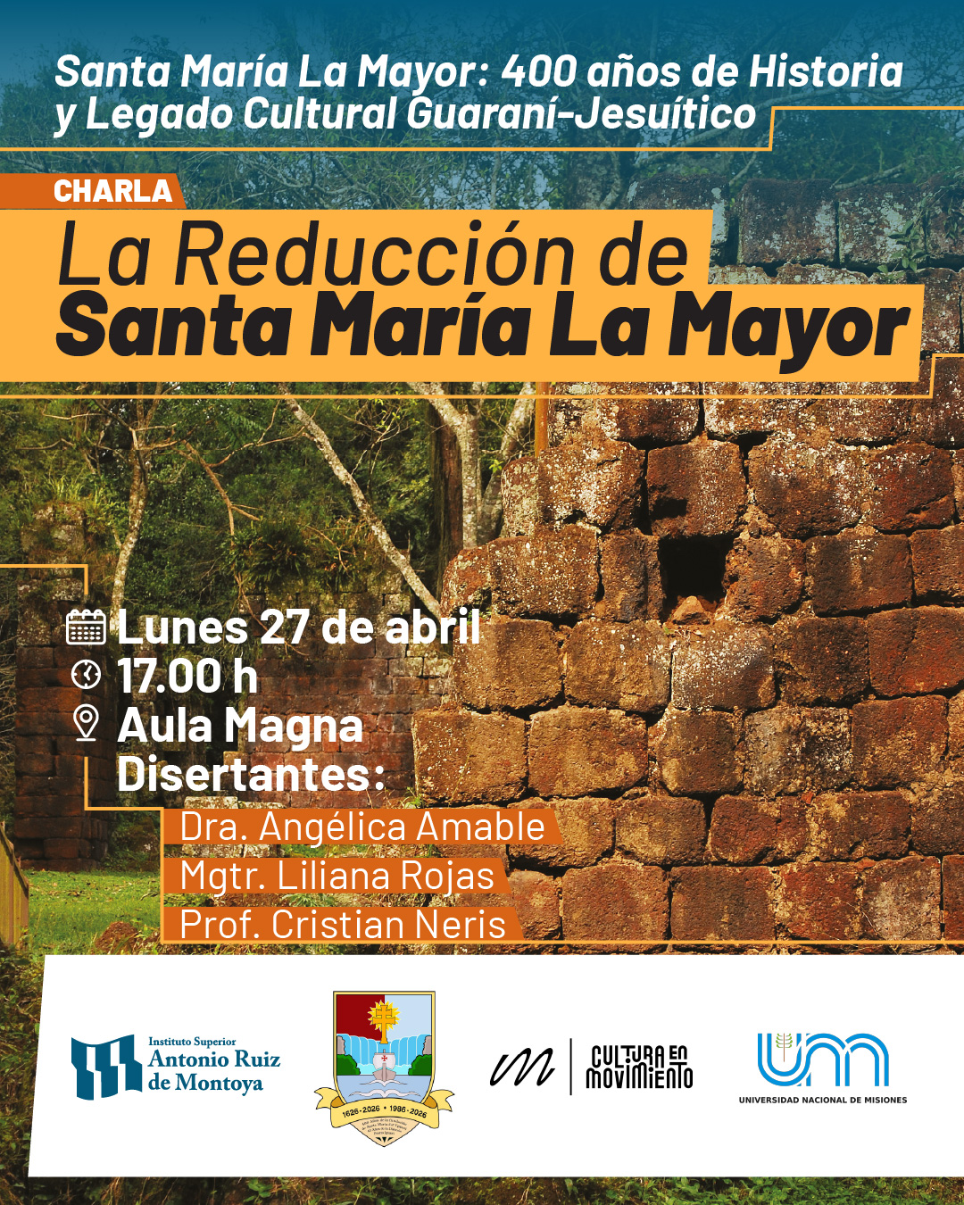 En el marco del Año del Legado Guaraní Jesuítico, este lunes desde las 17 se realizará en el Aula Magna del Instituto Superior Antonio Ruiz de Montoya una charla abierta sobre los 400 años de la reducción de Santa María la Mayor, uno de los sitios históricos más relevantes de Misiones. La actividad también podrá seguirse por streaming a través del canal oficial de YouTube de la institución.