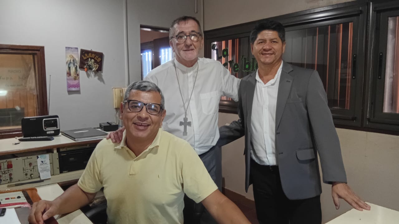 En la imagen, de izquierda a derecha: Julio Duarte, operador; Mons. Juan Rubén Martínez; y el periodista Sergio Javier Benítez