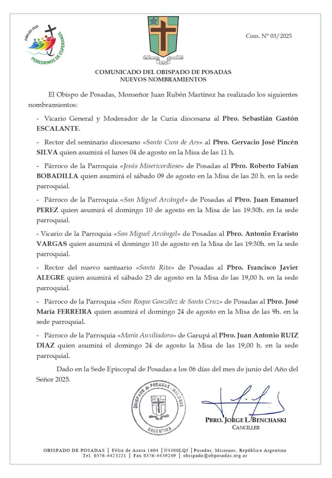 A través del Comunicado Oficial N° 03/2025, firmado este 6 de junio por el Canciller Pbro. Jorge L. Benchaski, se detallan las nuevas responsabilidades asignadas por el obispo diocesano, monseñor Juan Rubén Martínez.