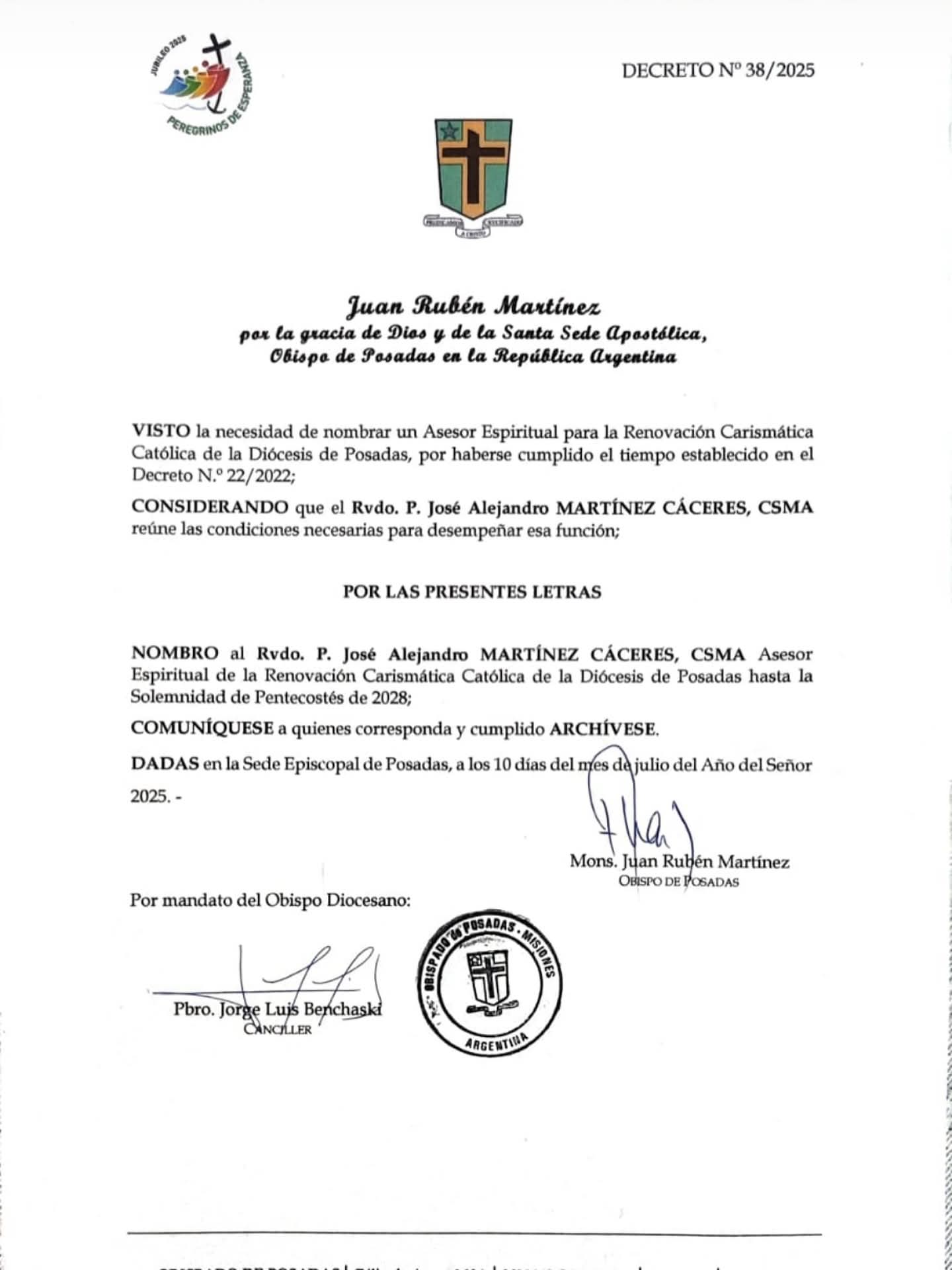 Mediante el Decreto N.º 38/2025, el obispo de Posadas, monseñor Juan Rubén Martínez, oficializó el nombramiento del Rvdo. P. José Alejandro Martínez Cáceres, CSMA, como nuevo asesor espiritual de la Renovación Carismática Católica de la Diócesis de Posadas. La decisión fue tomada considerando el cumplimiento del período establecido en el anterior Decreto N.º 22/2022.