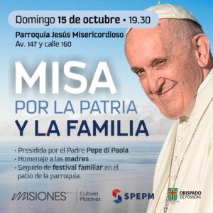 En este sentido invitó a todos los fieles a que el día 15 de octubre, se acerquen a la Parroquia Jesús Misericordioso, “porque vamos tener una misa a las 19.30 horas, en dicha parroquia en donde nos recibirá junto al Padre Gervasio, el Padre José María «Pepe» Di Paola”, coordinador de Los Hogares de Cristo e integrante del Equipo de Curas de villas y barrios populares porteños y bonaerenses, para una Misa por la Patria y la Familia.