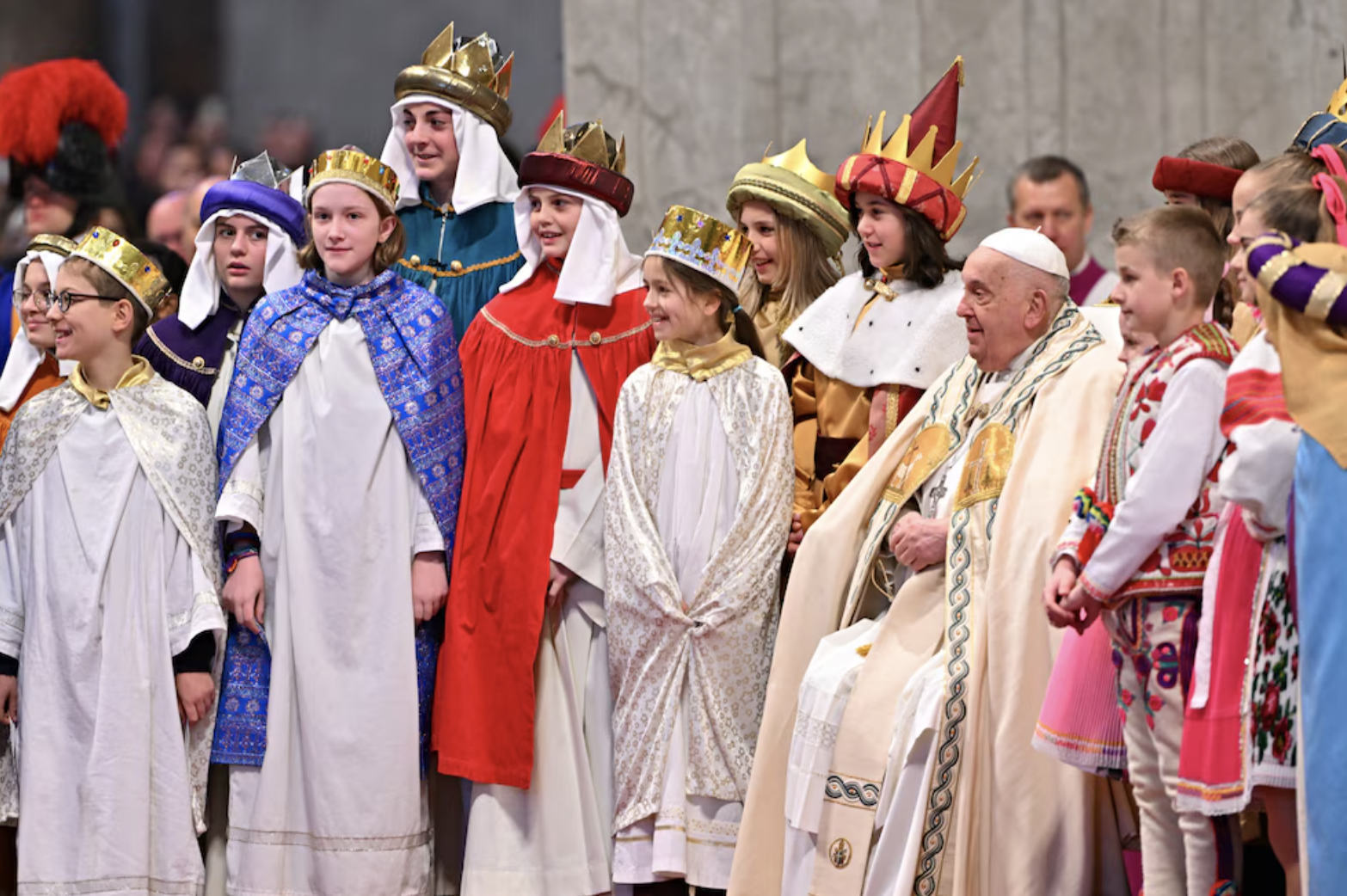 «Hoy no tenemos báculos, sino un corazón de niño, una voz. Así que, todos juntos, saludemos a la Santa Madre de Dios», invitando a la asamblea a repetir tres veces las palabras «¡Santa Madre de Dios!».