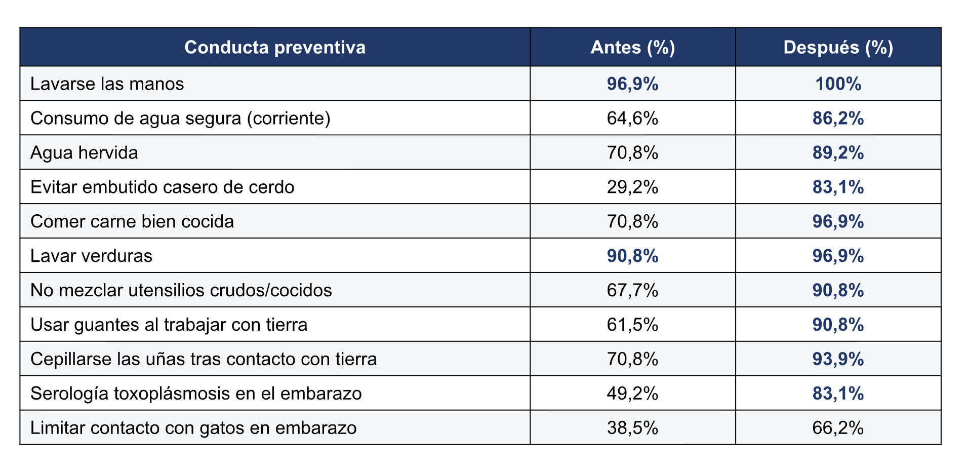 Los resultados del estudio evidencian un impacto significativo en el conocimiento de los docentes. Entre los cambios más relevantes se destacan el reconocimiento de prácticas de riesgo y la importancia de la serología durante el embarazo. Asimismo, el porcentaje de docentes que identifican correctamente las conductas preventivas se incrementó de manera sustancial tras la capacitación.