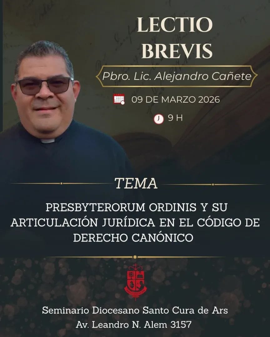 El Seminario Diocesano Santo Cura de Ars realizará el próximo lunes 9 de marzo a las 9 una Lectio Brevis a cargo del Pbro. Lic. Alejandro Cañete, quien abordará el tema “Presbyterorum Ordinis y su articulación jurídica en el Código de Derecho Canónico”.