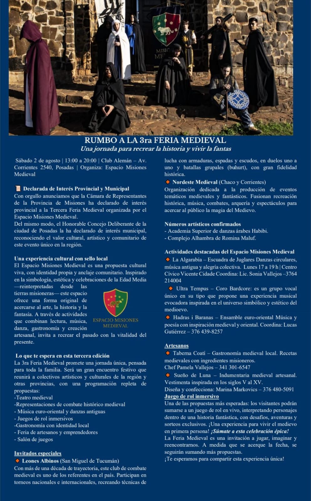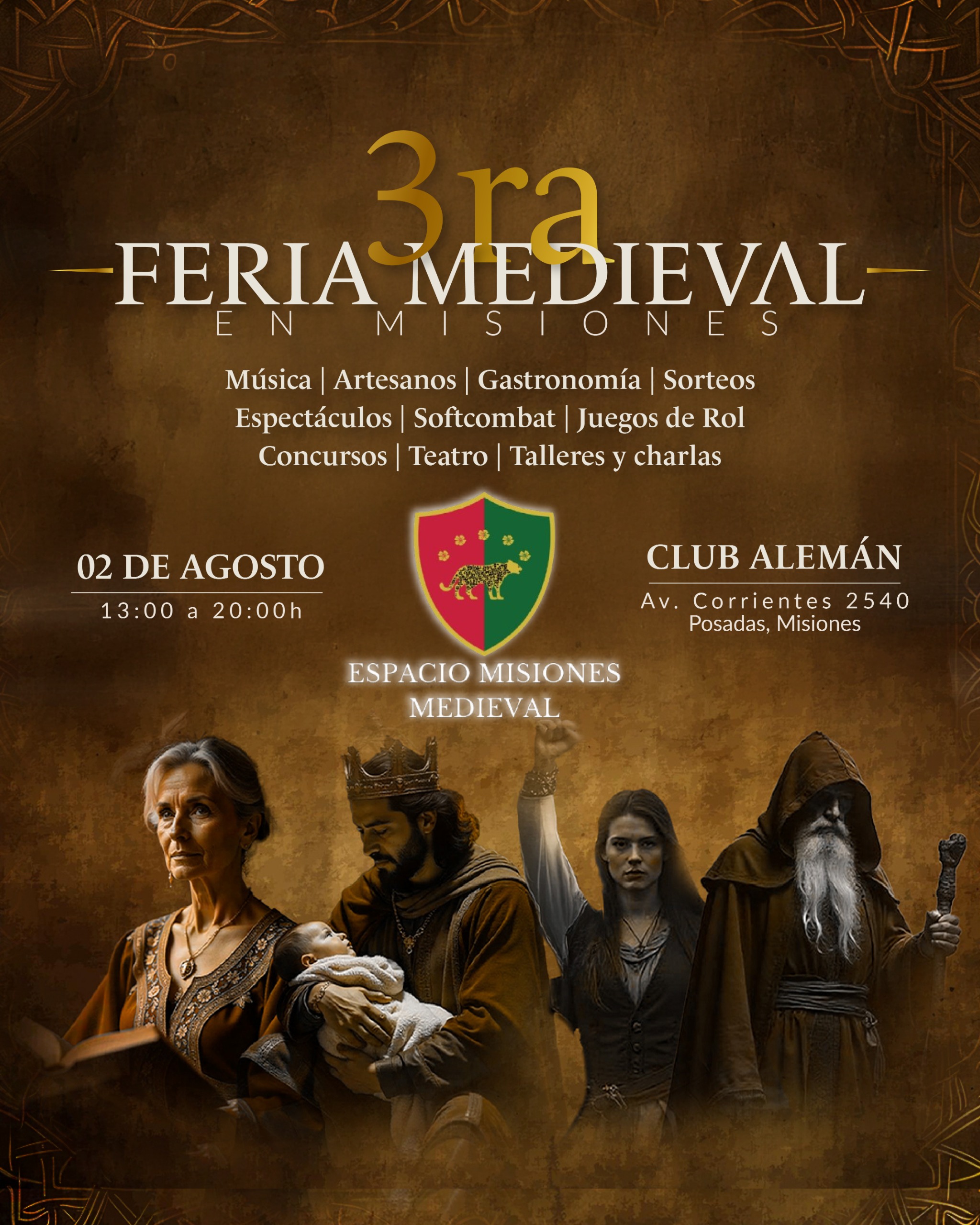 Este fin de semana, la capital provincial se prepara para revivir el espíritu de la Edad Media con una propuesta cultural y deportiva sin precedentes: la tercera edición de la Feria Medieval, organizada por el espacio Misiones Medieval, que se realizará el sábado 2 de agosto de 13 a 20 en el Club Alemán de Posadas. Como antesala, el viernes 1° de agosto a las 19 se desarrollará un ateneo-debate sobre Neomedievalismos y Deporte, en el Centro Cultural ubicado en Av. Corrientes 1432, con transmisión en vivo por YouTube.