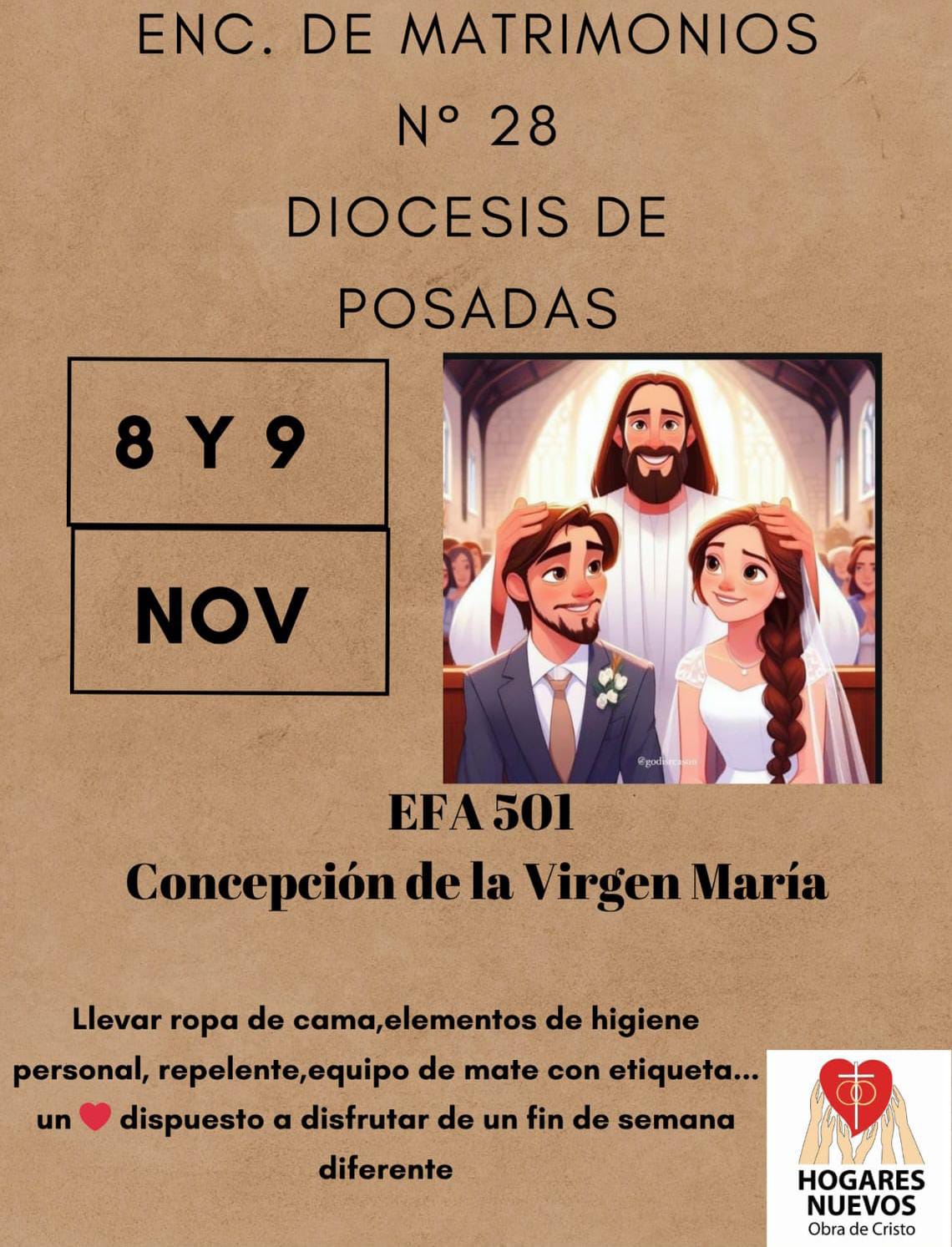 El movimiento diocesano invita a las parejas de la zona sur de Misiones a participar del retiro espiritual los días 8 y 9 de noviembre en la EFA N° 501 “Concepción de la Virgen María”, con el objetivo de fortalecer la vida matrimonial y familiar desde la fe.