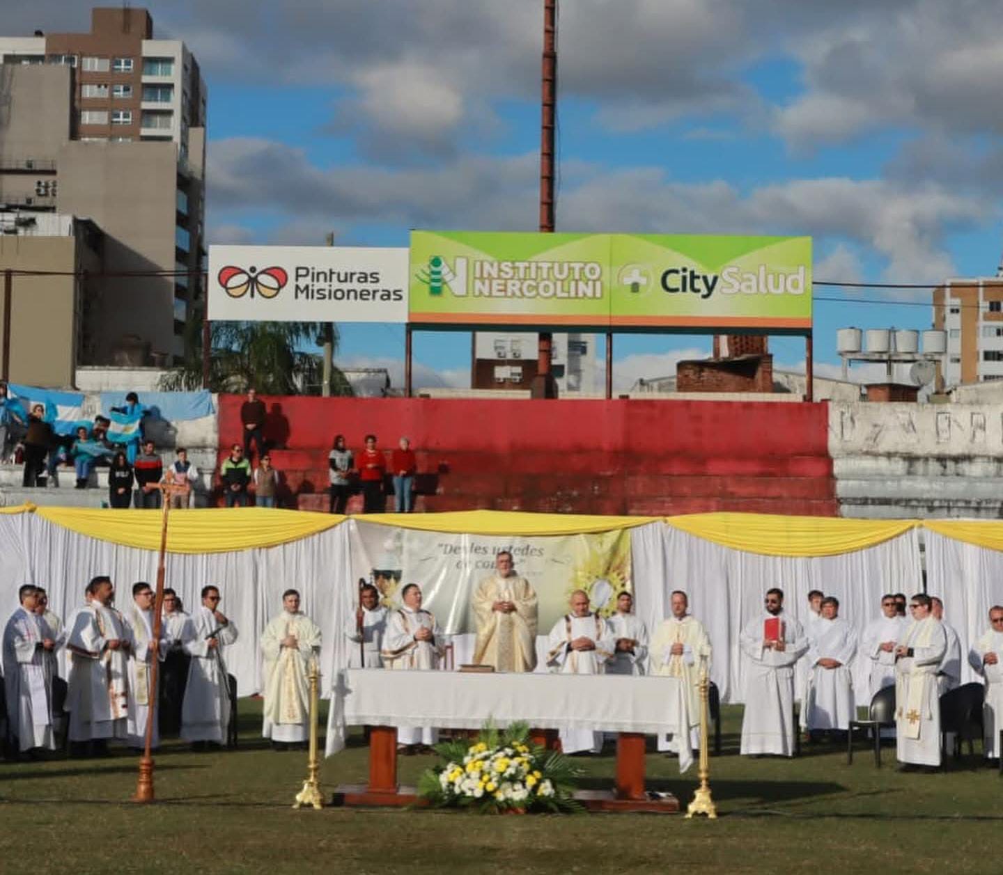 Este sábado por la tarde, la Diócesis de Posadas celebró con gran fervor la Fiesta del Corpus Christi en la cancha de Guaraní Antonio Franco, convocando a miles de fieles bajo el lema “Denles ustedes de comer”. La jornada, que reunió a parroquias, colegios e instituciones de la ciudad y alrededores, incluyó actividades de animación y una obra teatral. La Santa Misa, presidida por el obispo Juan Rubén Martínez, culminó con una procesión hasta la Plaza 9 de Julio, donde se impartió la bendición solemne.