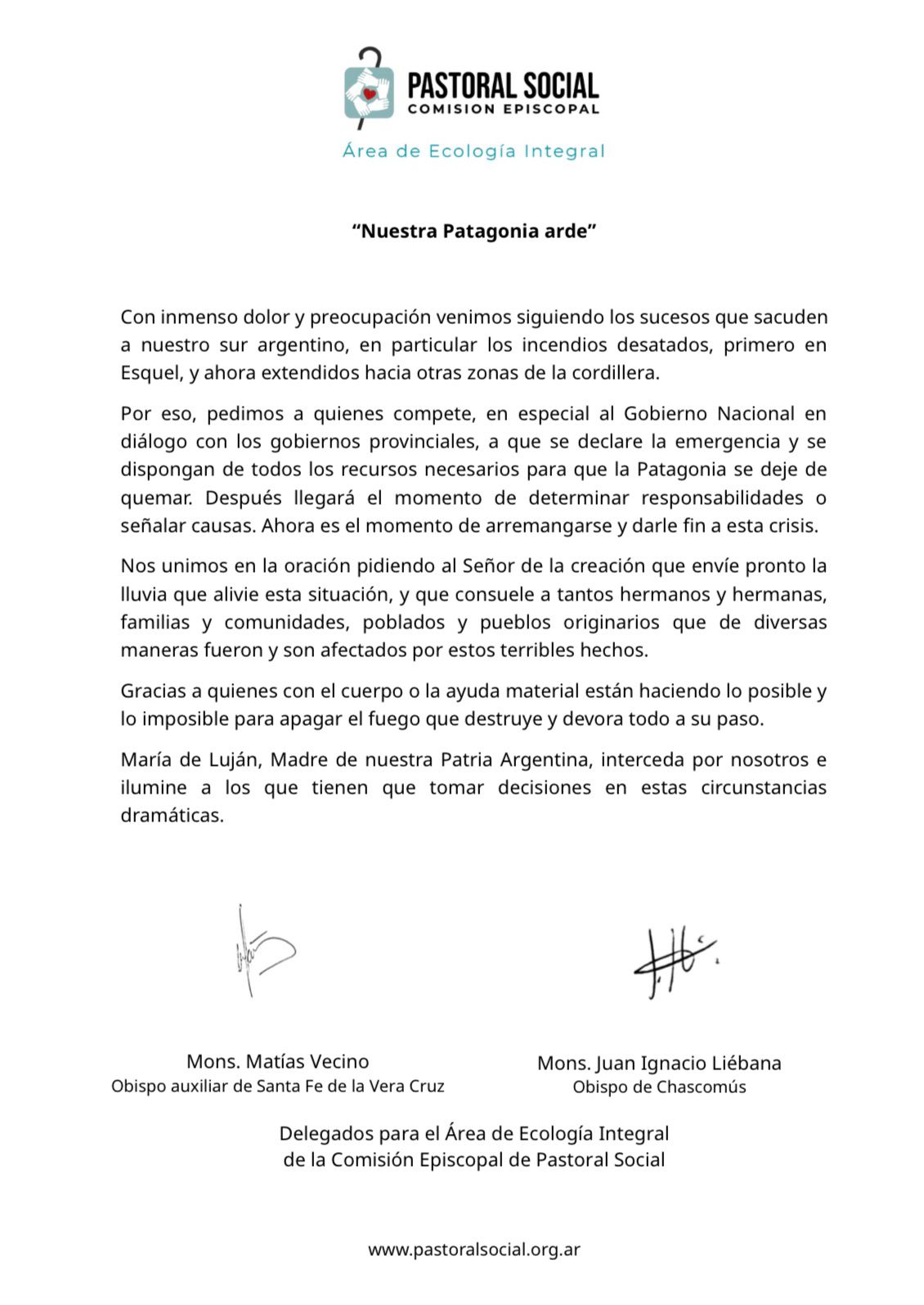 El mensaje, firmado por los obispos Matías Vecino y Juan Ignacio Liébana, responsables del área de Ecología Integral, expresó un especial apoyo a las familias, comunidades y pueblos originarios que han perdido bienes o terrenos. Asimismo, destacaron la labor de los brigadistas y voluntarios que trabajan en la primera línea de fuego.