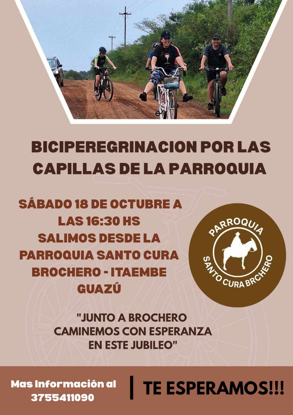 La Parroquia Santo Cura Brochero de Itaembé Guazú, Posadas, invita a la comunidad a participar de la primera biciperegrinación por sus capillas, que se realizará el sábado 18 de octubre a las 16.30, con salida desde el templo parroquial ubicado en la entrada del barrio.