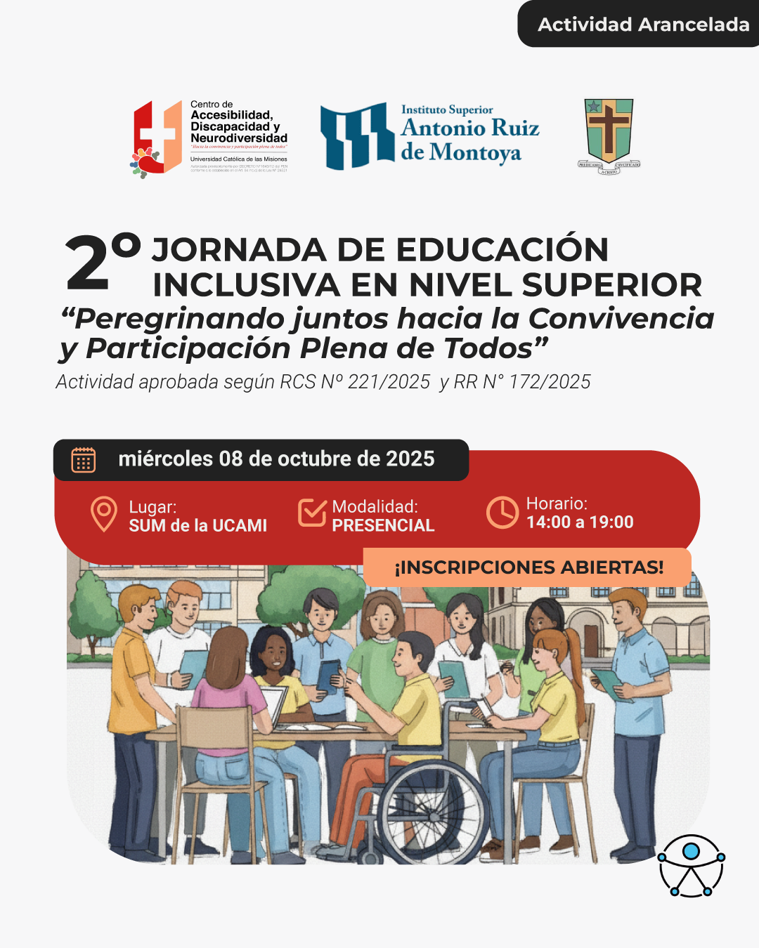 Se llevará a cabo la SEGUNDA JORNADA DE EDUCACIÓN INCLUSIVA EN EL NIVEL SUPERIOR “Peregrinando juntos hacia la Convivencia y Participación plena de Todos” el miércoles 08 de octubre de 14:00 a 19:00 en el SUM de la UCAMI