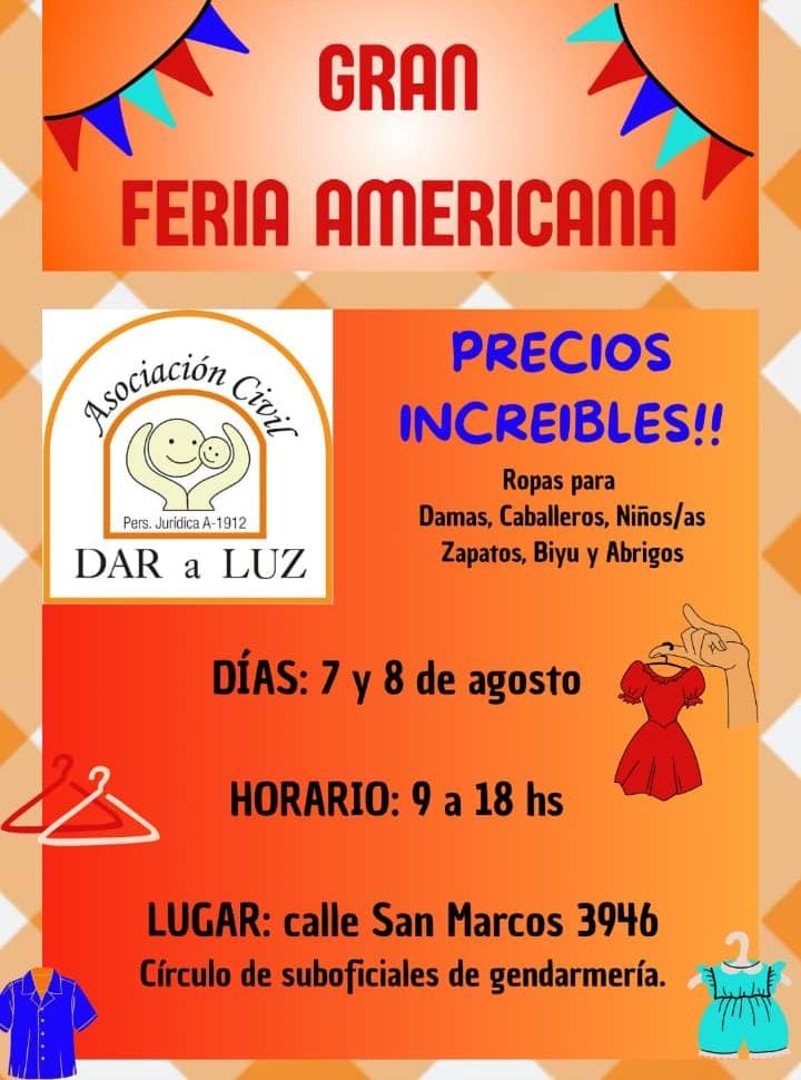 La Asociación Civil “Dar a Luz”, con 26 años de compromiso voluntario en el Hospital Materno Neonatal de Posadas, realizará su segunda feria americana del año los días jueves 7 y viernes 8 de agosto, de 9 a 18 horas, en el Círculo de Suboficiales de Gendarmería, ubicado en calle San Marcos 3946, Villa Urquiza.