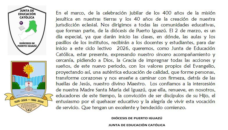 La Junta de Educación Católica de la Diócesis de Puerto Iguazú expresó su acompañamiento a las comunidades educativas de la jurisdicción eclesial ante el inicio del ciclo lectivo 2026, previsto para el 2 de marzo.