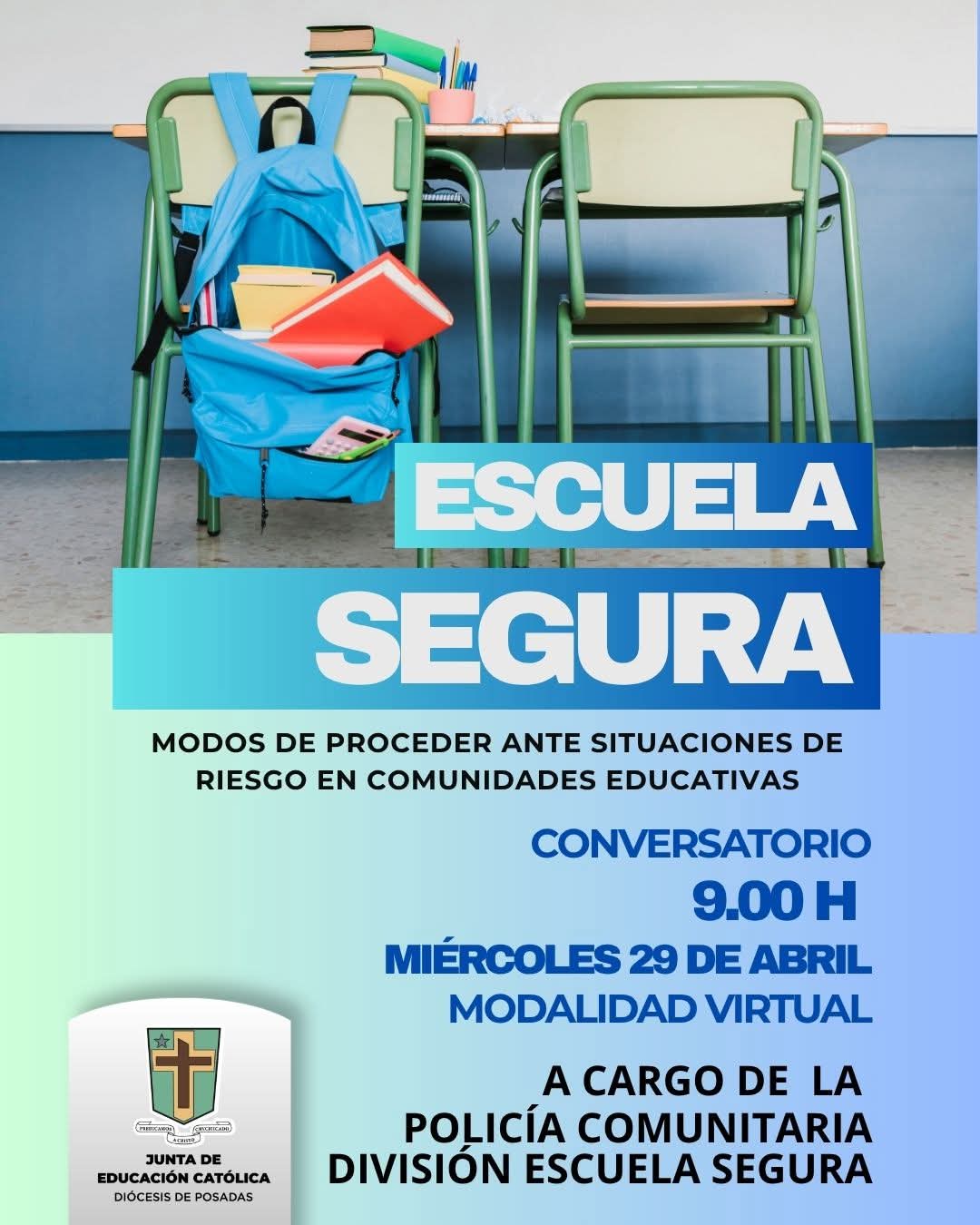 La Junta de Educación Católica del Obispado de Posadas invitó a participar del conversatorio denominado “Escuela Segura, modos de proceder ante situaciones de riesgo en las Comunidades Educativas”, una propuesta orientada a brindar herramientas de prevención y actuación ante distintos escenarios que puedan presentarse en el ámbito escolar.