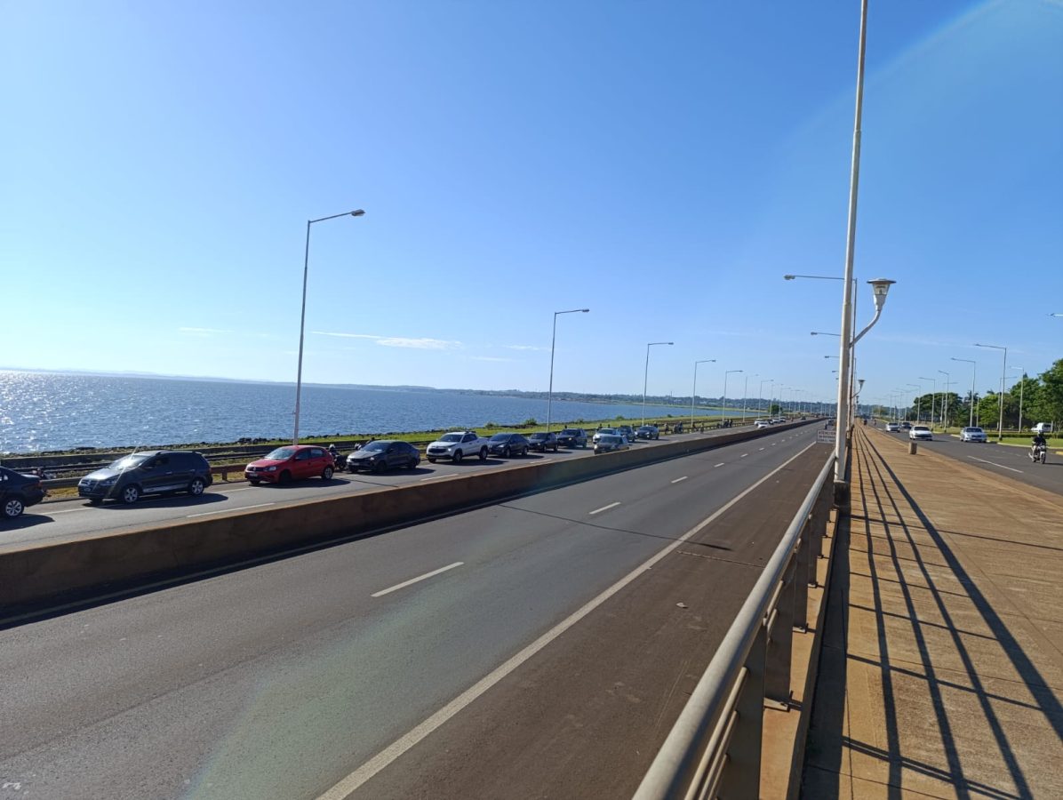Durante la jornada de este sábado se registran largas filas de vehículos en la zona del puente internacional San Roque González de Santa Cruz, que une Posadas con Encarnación.