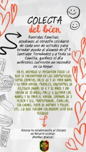 Por otra parte, el Instituto Madre de la Misericordia se suma a este gesto solidario. Después del incendio que afectó la vivienda del estudiante de sexto grado, Santiago Fernández, el Instituto ha iniciado una «Colecta del Bien» para respaldar a esta familia en su proceso de recuperación. En el lamentable incidente, se perdió una considerable cantidad de pertenencias vitales de la familia, incluyendo: