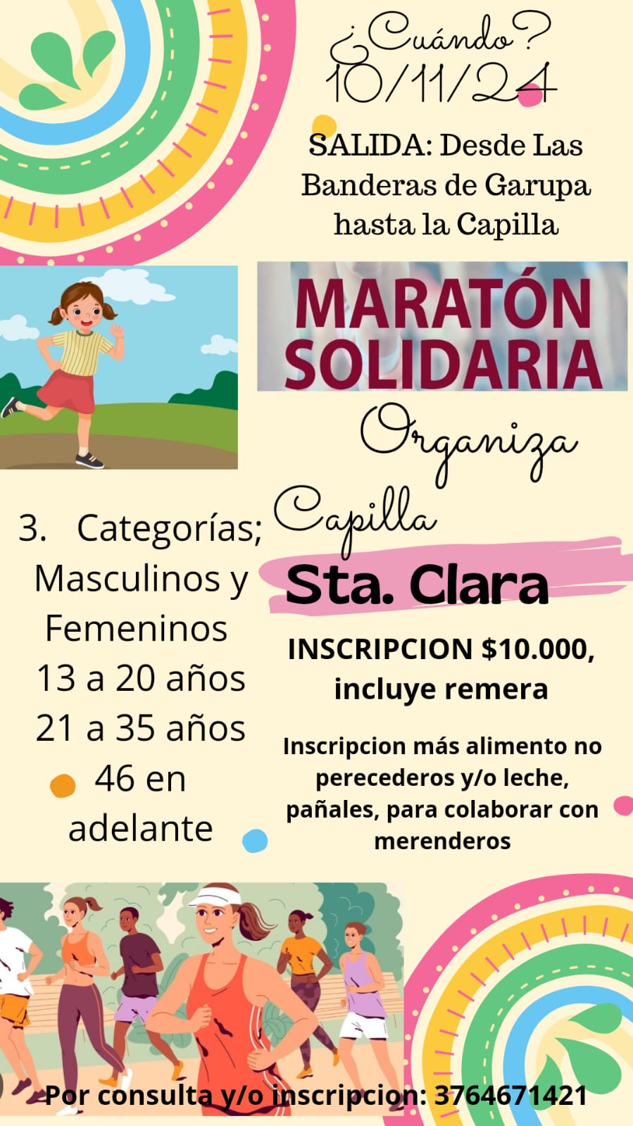El próximo 10 de noviembre de 2024, se llevará a cabo una maratón solidaria que comenzará desde Las Banderas de Garupá hasta la Capilla Santa Clara. Este evento, organizado por la comunidad local, tiene como objetivo recaudar fondos y alimentos no perecederos para colaborar con merenderos de la zona.