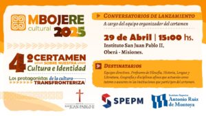 El Proyecto Misiones Mbojere Cultural 2025, certamen que invita a estudiantes del nivel secundario de la provincia, del Norte de Corrientes, de Brasil y de Paraguay, a indagar en la identidad cultural de la región, se pondrá en marcha por cuarto año consecutivo, con conversatorios que se llevarán a cabo en las localidades de Eldorado, Bernardo de Irigoyen y Oberá. De esta forma, capacitadores del equipo organizador de Mbojere Cultural comenzarán hoy a mantener encuentros con equipos directivos, profesores de Filosofía, Geografía, Historia, Lengua y Literatura y disciplinas afines que actuarán como tutores o asesores en las instituciones que participen del certamen y conocerán sus inquietudes en torno a la temática a investigar en la presente edición, titulada “Los protagonistas de la cultura transfronteriza”.