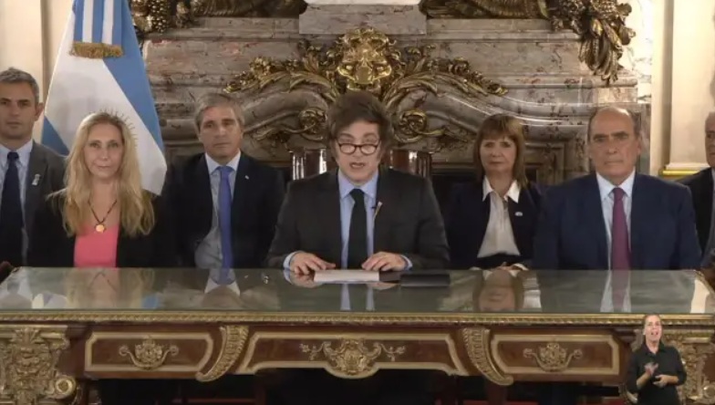Luego de los anuncios económicos de Luis Caputo y Santiago Bausili de que, entre otras cosas, este lunes se levantará el cepo cambiario, Javier Milei habló por cadena nacional junto a todo su Gabinete para dar un fuerte mensaje político de celebración y agradecer al Fondo Monetario Internacional y otros organismos por el respaldo económico.