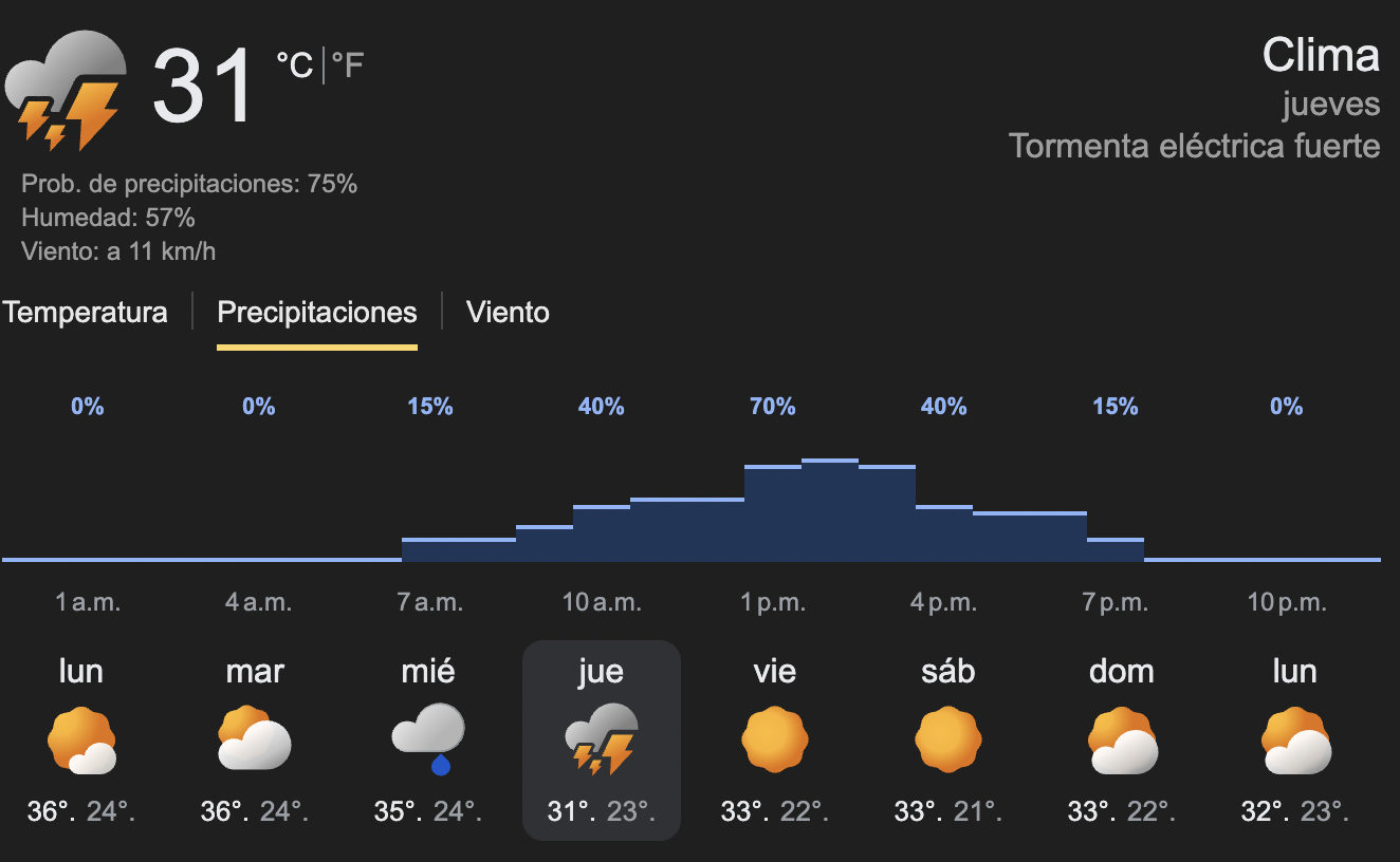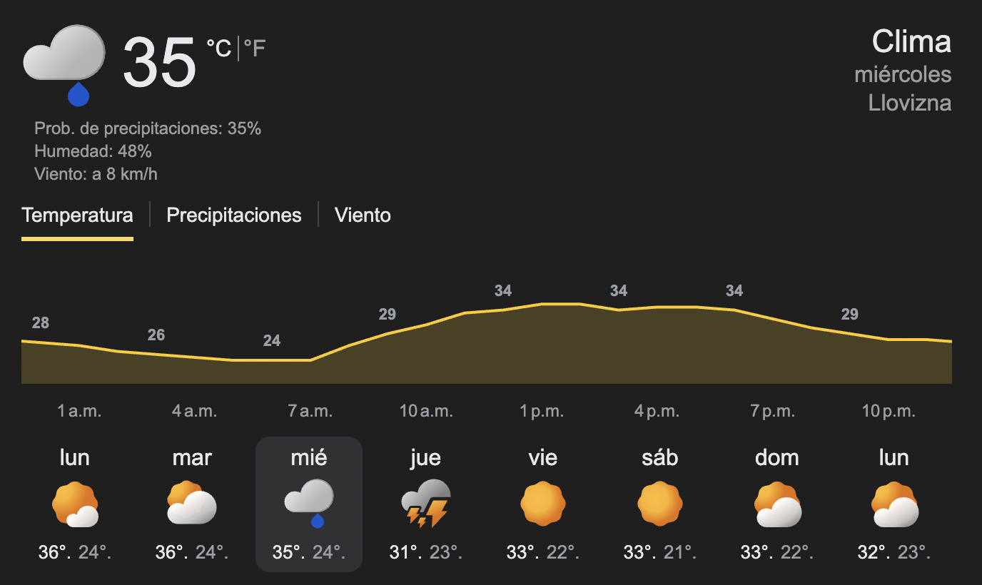 Miércoles 28: La inestabilidad comienza a ganar terreno. Una vaguada generará lluvias y tormentas aisladas por la tarde, especialmente en los extremos sur y norte. El ambiente continuará caluroso, con máximas de 34°C.