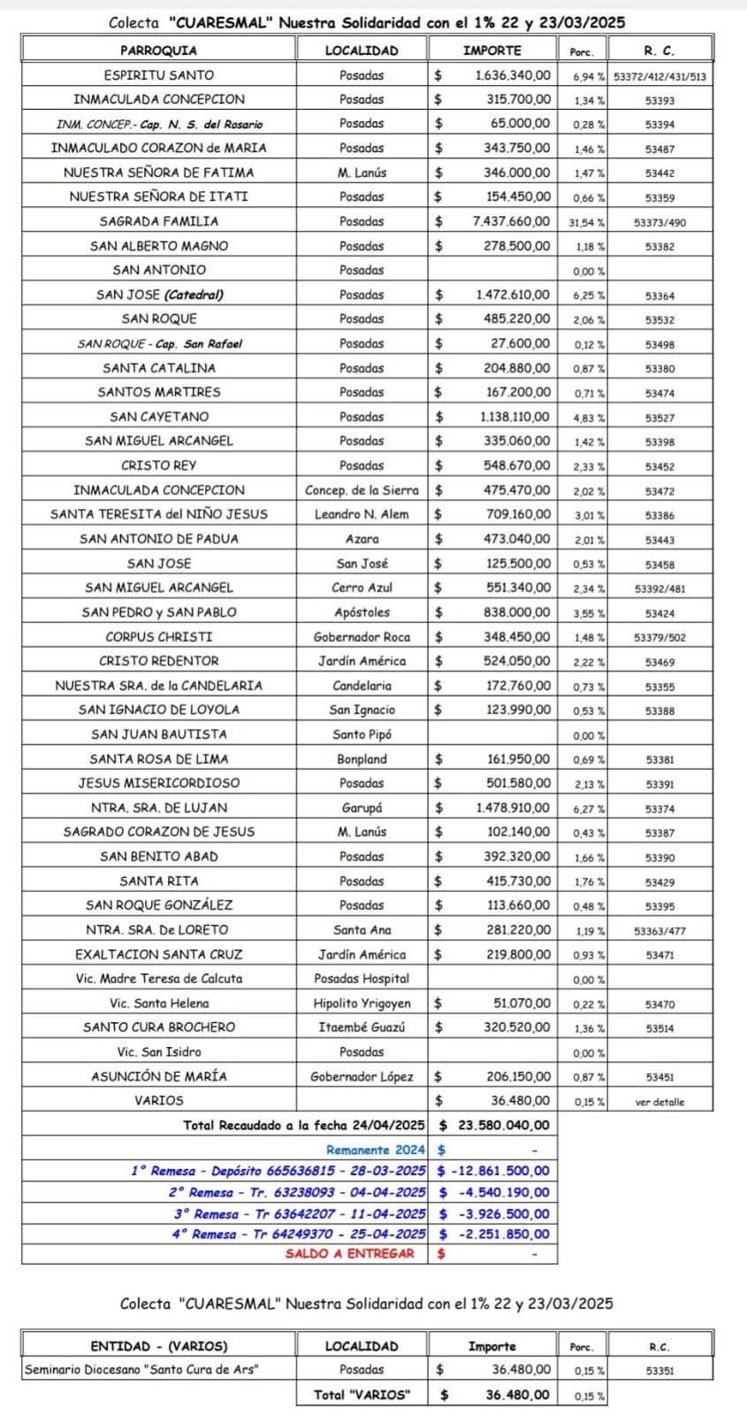 Esta colecta, administrada por Cáritas Diocesana, alcanzó este año una cifra cercana a los 24 millones de pesos. “La parroquia Sagrada Familia fue la que más aportó, con más de 7 millones de pesos. También se destacaron Espíritu Santo (1,6 millones), Nuestra Señora de Luján de Garupá (1,5 millones) y la Catedral (1,4 millones)”, enumeró el obispo. Asimismo, mencionó que las parroquias de San Antonio (Posadas) y San Juan Bautista (Santo Pipó) no registraron aportes este año.