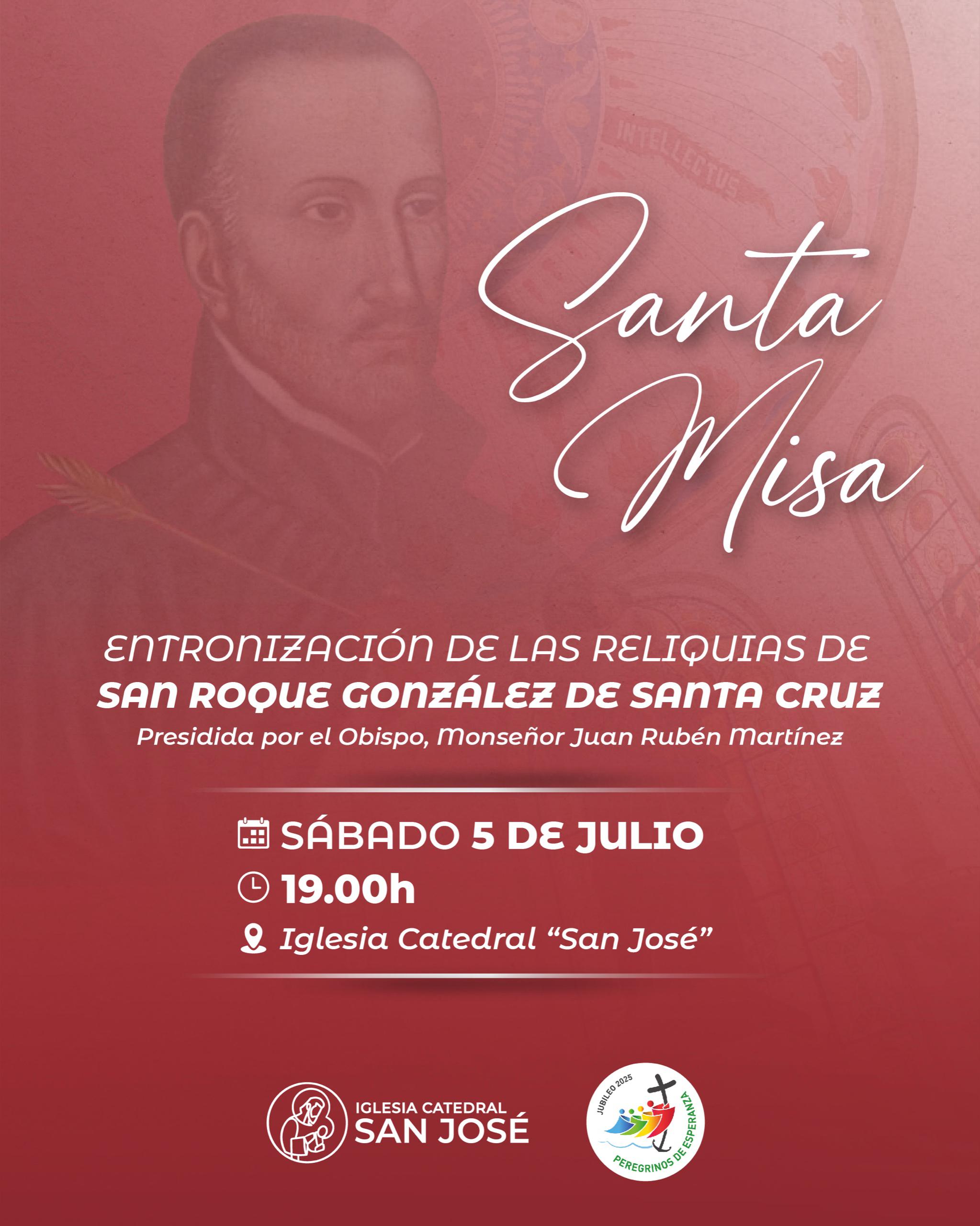 En otro tramo de la entrevista, monseñor Martínez anunció con entusiasmo que este sábado 5 de julio, a las 19 horas, se celebrará una misa en la Catedral San José de Posadas, en la que se entronizarán reliquias de primer grado de San Roque González, fundador de la ciudad en 1615, durante su primera fundación bajo el nombre de Nuestra Señora de la Anunciación de Itapúa. Las reliquias, que se encontraban en el Colegio Santa María y estaban bajo custodia de las religiosas, serán colocadas en un espacio especialmente preparado al costado en la capilla de San José.