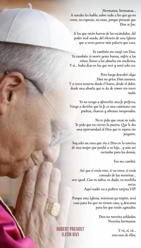 Aprovechando la ocasión, compartió un texto que lo había impactado profundamente, el cual le fue enviado y alude a la forma de ser del cardenal Prevost, recientemente elegido como Papa León XIV.