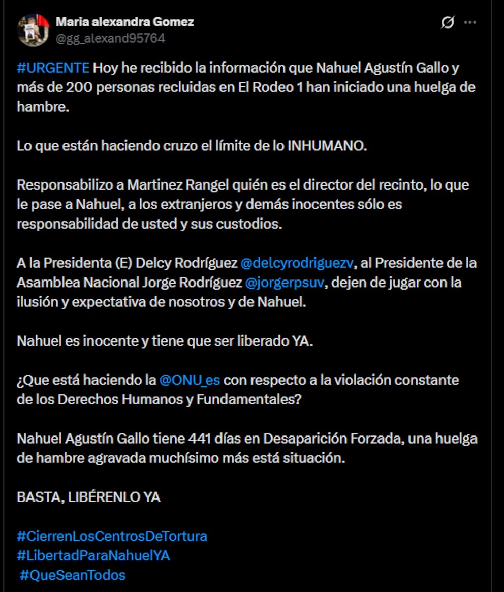 La información fue difundida por su esposa, María Alexandra Gómez, quien denunció la situación a través de sus redes sociales. “Lo que están haciendo cruzó el límite de lo inhumano”, escribió, y responsabilizó al director del penal, Martínez Rangel, y a las autoridades venezolanas por cualquier consecuencia que pudiera sufrir Gallo y los demás detenidos.