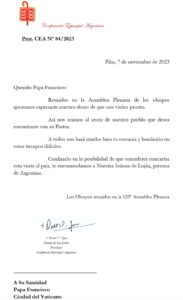 Los obispos de nuestro país reunidos en la 123° Asamblea Plenaria del Episcopado le expresan al Papa Francisco el deseo de una pronta visita suya a la Argentina.