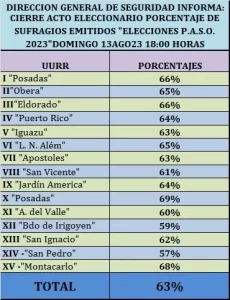 En Posadas votó cerca del 67% del padrón; en Oberá y Alem el 65%; y en Eldorado el 66%. Puerto Rico registró el 64% e Iguazú y Apóstoles el 63%.