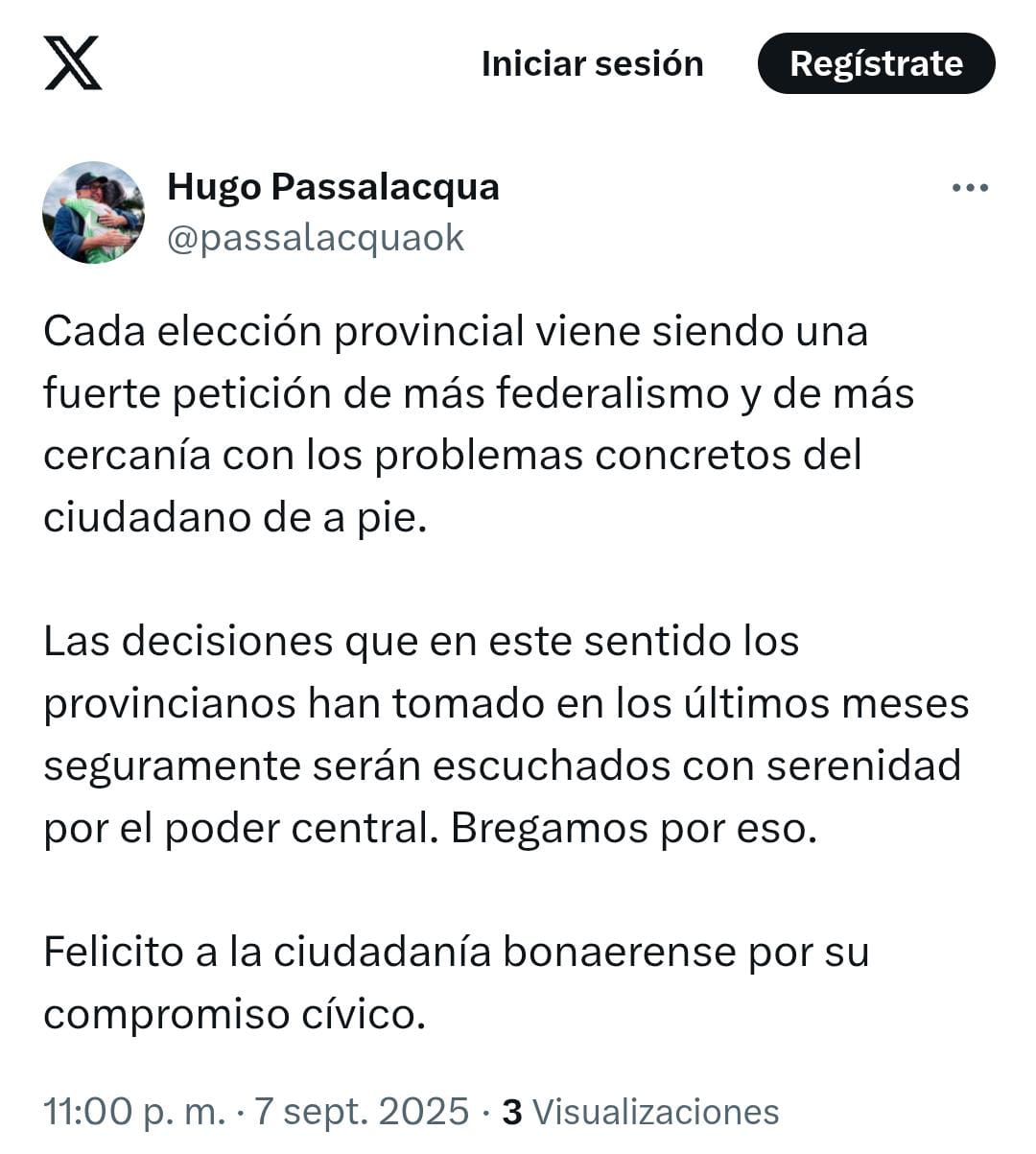 A través de un mensaje publicado en sus redes sociales, Passalacqua afirmó que “cada elección provincial viene siendo una fuerte petición de más federalismo y de más cercanía con los problemas concretos del ciudadano de a pie”.