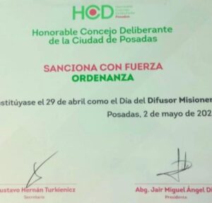 La Asociación Misionera de Difusores del Folklore (AMIDIF) se enorgullece al anunciar que el Honorable Concejo Deliberante (HCD) de Posadas ha oficializado el 29 de abril como el «Día del Difusor Misionero» en la capital provincial. Desde la cuenta de @difusoresmisionesfolklore, expresan: «¡Hoy hemos dado un paso más!», resaltando su labor en diversos espacios culturales, escenarios y medios de comunicación, personificada en la figura de Ricardo Manuel Odziomek.