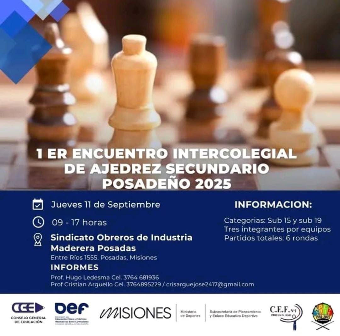 El próximo jueves 11 de septiembre se realizará en Posadas el Primer Encuentro Intercolegial de Ajedrez Secundario 2025, una iniciativa impulsada por la Asociación Posadeña de Estudiantes Secundarios (APES), en conjunto con la Dirección de Educación Física, el Ministerio de Deportes y el Consejo General de Educación (CGE).