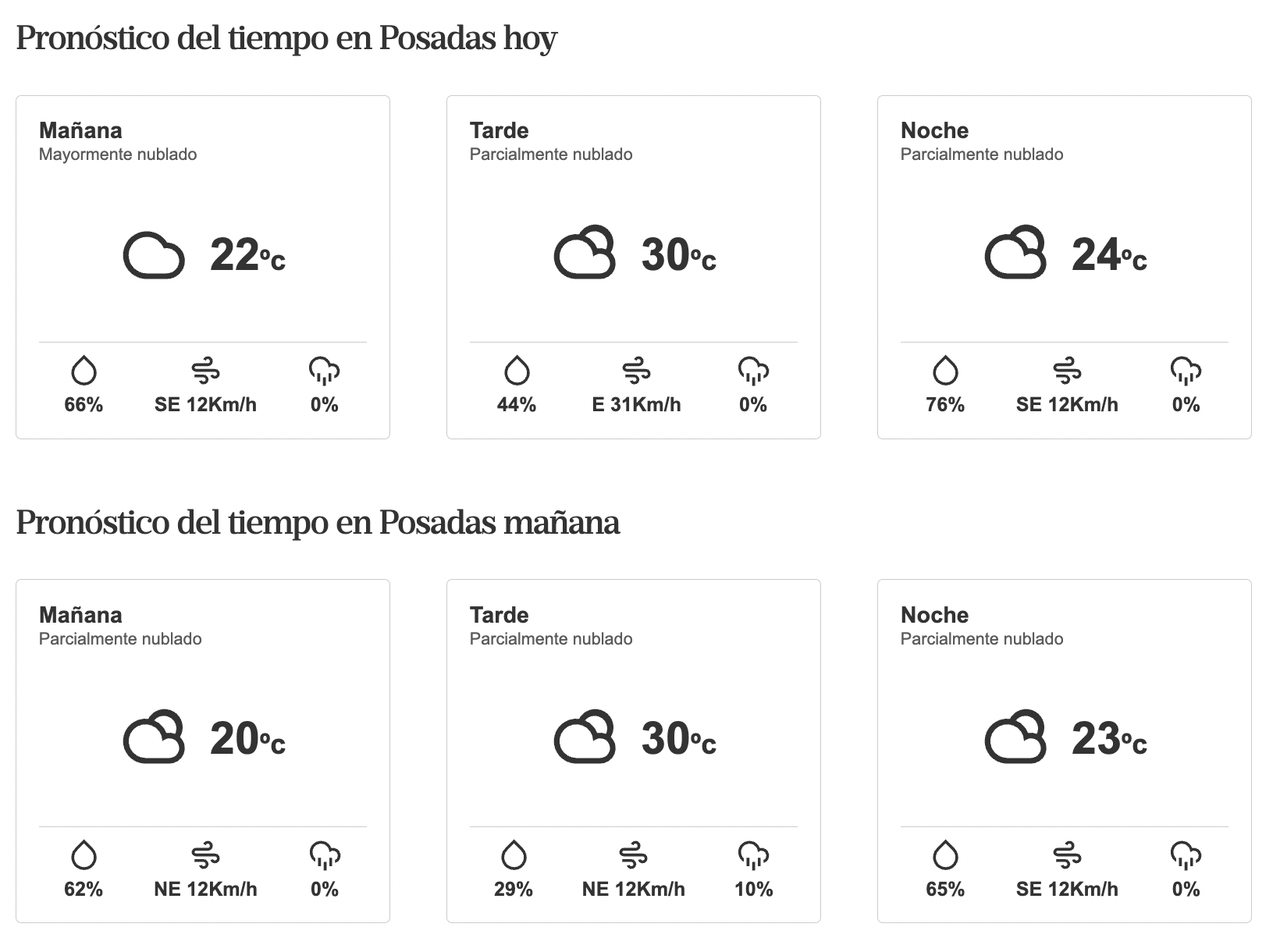 De acuerdo al parte del Servicio Meteorológico Nacional, el clima en esta ciudad de Posadas se presentaría sin lluvias, y los vientos del sudeste correrán a una velocidad de entre 7 y 12 kilómetros por hora. La humedad sería del 78 por ciento, y la visibilidad sería buena.